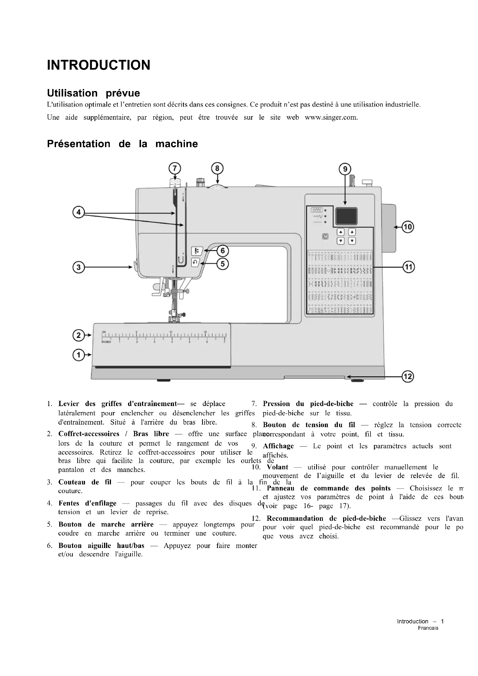 - N'utilisez cette machine à coudre que pour son usage prévu, comme décrit dans ce manuel. N'utilisez que les accessoires recommandés par le fabricant, conformément aux indications fournies dans ce manuel.