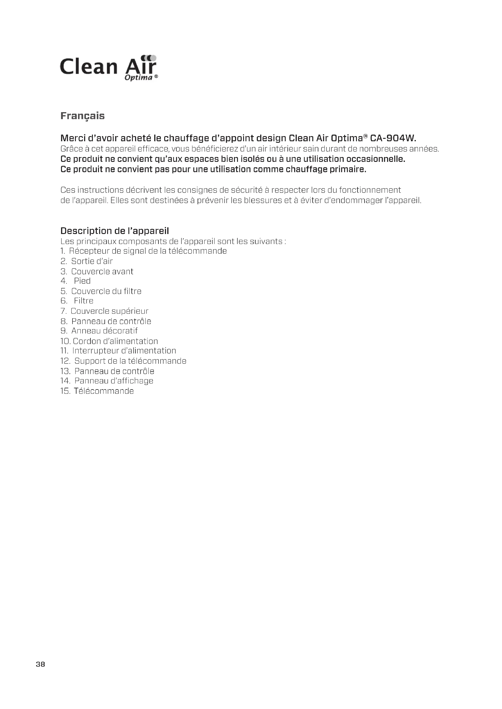 Clean Air Optima International B.V. | David Ricardostraat 9-7 / 9-9 | 7559 SH Hengelo (ov) Nederland | Telefoon: +31 (0) 74 - 2670145 Clean Air Optima Duitsland GmbH | Enschedestraße 14 | 48529 Nordhorn | Telefoon Duitsland: +49 (0) 5921 879-121 E-mail: info@cleanairoptima.com Internet: www.cleanairoptima.com38 Français Merci d’avoir acheté le chauage d’appoint design Clean Air Optima® CA-904W. Grâce à cet appareil ecace, vous bénéficierez d’un air intérieur sain durant de nombreuses années. Ce produit ne convient qu’aux espaces bien isolés ou à une utilisation occasionnelle. Ce produit ne convient pas pour une utilisation comme chauage primaire. Ces instructions décrivent les consignes de sécurité à respecter lors du fonctionnement de l’appareil. Elles sont destinées à prévenir les blessures et à éviter d’endommager l’appareil. Description de l’appareil Les principaux composants de l’appareil sont les suivants: