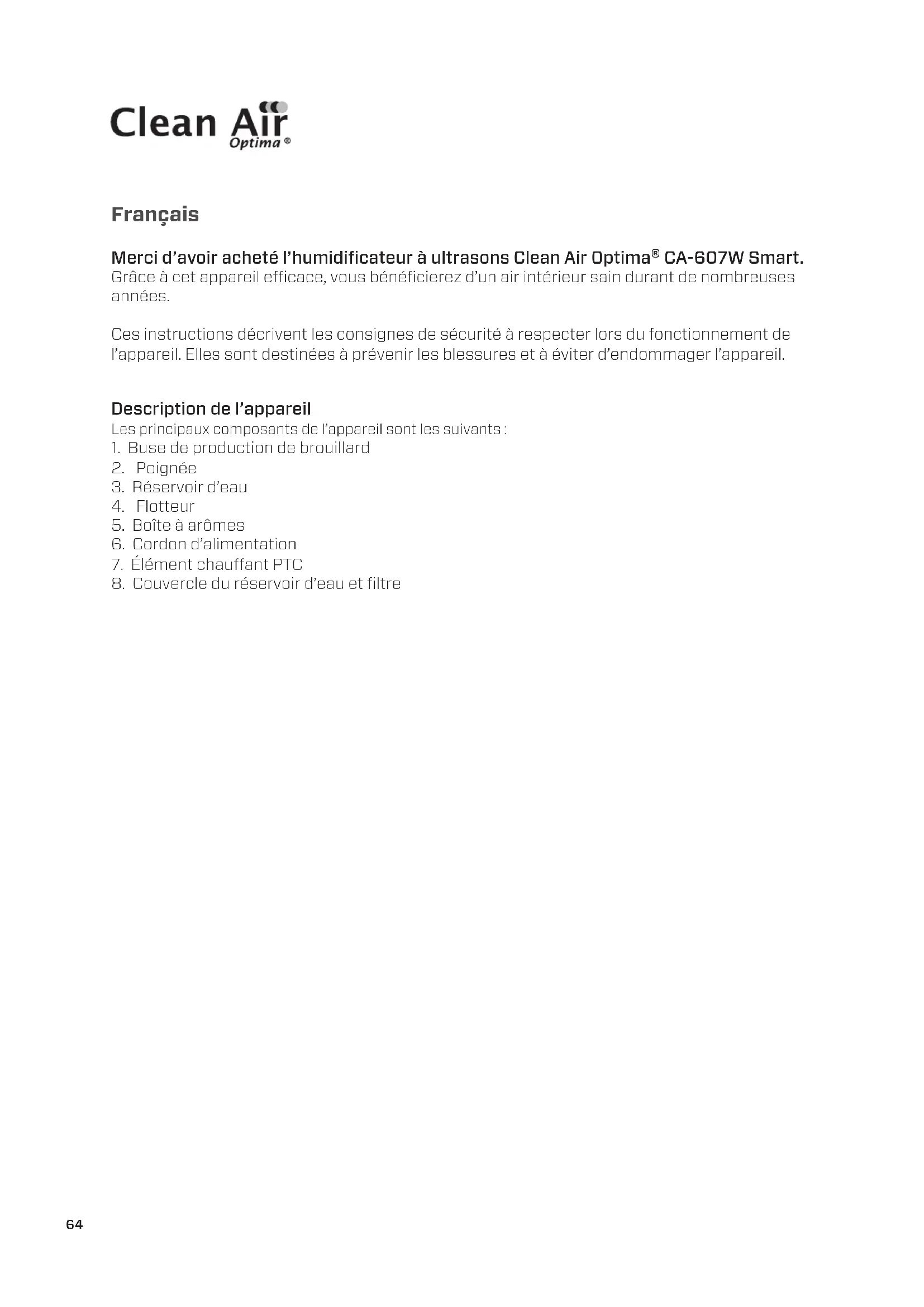 CA-607W Smart / Achage64 Français Merci d’avoir acheté l’humidificateur à ultrasons Clean Air Optima® CA-607W Smart. Grâce à cet appareil ecace, vous bénéficierez d’un air intérieur sain durant de nombreuses années. Ces instructions décrivent les consignes de sécurité à respecter lors du fonctionnement de l’appareil. Elles sont destinées à prévenir les blessures et à éviter d’endommager l’appareil. Description de l’appareil Les principaux composants de l’appareil sont les suivants: