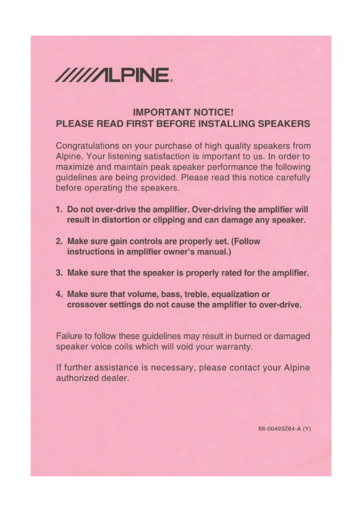 produit a Alpine pour obtenir une reparation (les demandes doivent etre presentees a compagnie transport). ® Les dommages causes par l'usure normale, les incidents l'abus, incluant bris des bobines acoustiques cause par l'usage abusif haut-parleur (niveau l'amplificateur trop haut, causant