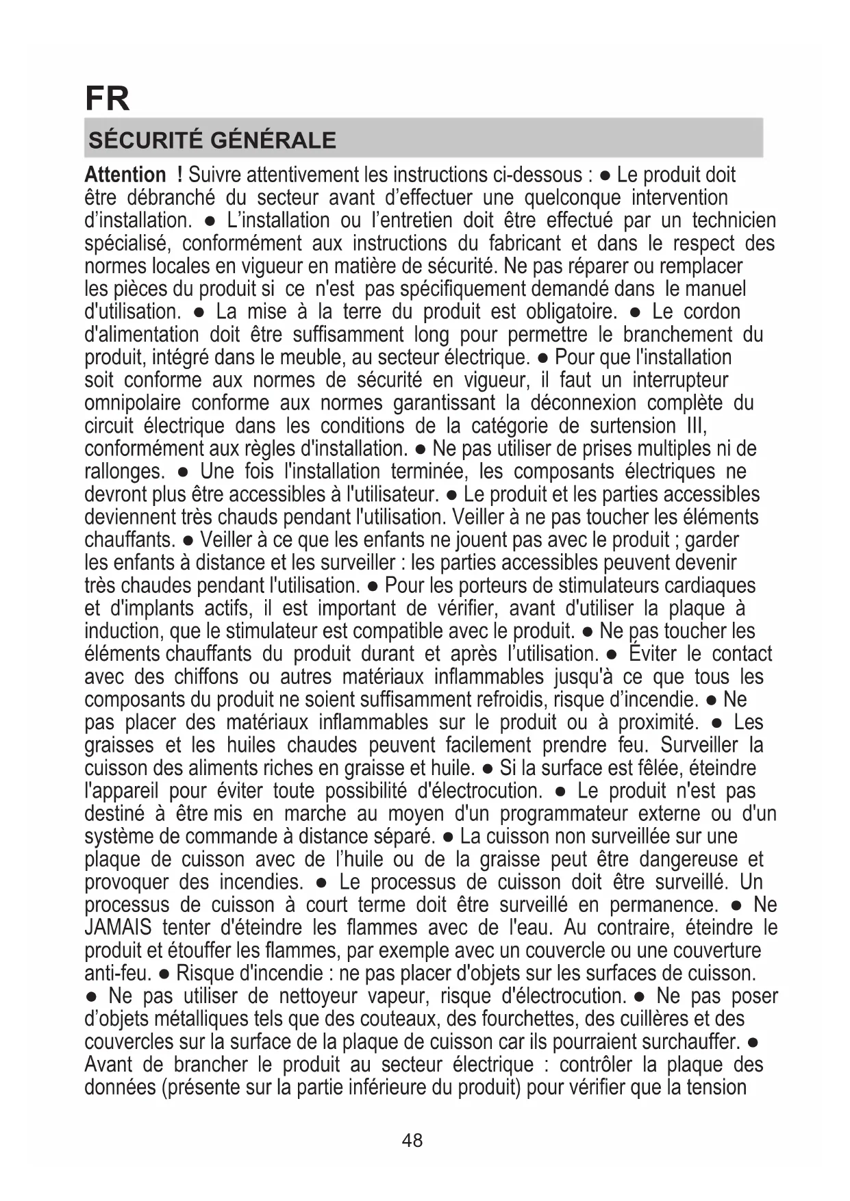 Attention! Suivre attentivement les instructions ci-dessous: ● Le produit doit être débranché du secteur avant d’effectuer une quelconque intervention d’installation. ● L’installation ou l’entretien doit être effectué par un technicien spécialisé, conformément aux instructions du fabricant et dans le respect des normes locales en vigueur en matière de sécurité. Ne pas réparer ou remplacer les pièces du produit si ce n'est pas spécifiquement demandé dans le manuel d'utilisation. ● La mise à la terre du produit est obligatoire. ● Le cordon d'alimentation doit être suffisamment long pour permettre le branchement du produit, intégré dans le meuble, au secteur électrique. ● Pour que l'installation soit conforme aux normes de sécurité en vigueur, il faut un interrupteur omnipolaire conforme aux normes garantissant la déconnexion complète du circuit électrique dans les conditions de la catégorie de surtension III, conformément aux règles d'installation. ● Ne pas utiliser de prises multiples ni de rallonges. ● Une fois l'installation terminée, les composants électriques ne devront plus être accessibles à l'utilisateur. ● Le produit et les parties accessibles deviennent très chauds pendant l'utilisation. Veiller à ne pas toucher les éléments chauffants. ● Veiller à ce que les enfants ne jouent pas avec le produit; garder les enfants à distance et les surveiller: les parties accessibles peuvent devenir très chaudes pendant l'utilisation. ● Pour les porteurs de stimulateurs cardiaques et d'implants actifs, il est important de vérifier, avant d'utiliser la plaque à induction, que le stimulateur est compatible avec le produit. ● Ne pas toucher les éléments chauffants du produit durant et après l’utilisation. ● Éviter le contact avec des chiffons ou autres matériaux inflammables jusqu'à ce que tous les composants du produit ne soient suffisamment refroidis, risque d’incendie. ● Ne pas placer des matériaux inflammables sur le produit ou à proximité. ● Les graisses et les huiles chaudes peuvent facilement prendre feu. Surveiller la cuisson des aliments riches en graisse et huile. ● Si la surface est fêlée, éteindre l'appareil pour éviter toute possibilité d'électrocution. ● Le produit n'est pas destiné à être mis en marche au moyen d'un programmateur externe ou d'un système de commande à distance séparé. ● La cuisson non surveillée sur une plaque de cuisson avec de l’huile ou de la graisse peut être dangereuse et provoquer des incendies. ● Le processus de cuisson doit être surveillé. Un processus de cuisson à court terme doit être surveillé en permanence. ● Ne JAMAIS tenter d'éteindre les flammes avec de l'eau. Au contraire, éteindre le produit et étouffer les flammes, par exemple avec un couvercle ou une couverture anti-feu. ● Risque d'incendie: ne pas placer d'objets sur les surfaces de cuisson. ● Ne pas utiliser de nettoyeur vapeur, risque d'électrocution. ● Ne pas poser d’objets métalliques tels que des couteaux, des fourchettes, des cuillères et des couvercles sur la surface de la plaque de cuisson car ils pourraient surchauffer. ● Avant de brancher le produit au secteur électrique : contrôler la plaque des données (présente sur la partie inférieure du produit) pour vérifier que la tension 48et la puissance correspondent à celle du secteur et que la prise est adéquate. En cas de doute, appeler un électricien qualifié. Important : ● Après utilisation, éteindre la plaque de cuisson au moyen du dispositif de commande et ne pas se fier uniquement au détecteur de casseroles. ● Éviter les débordements de liquide; pour faire bouillir ou chauffer des liquides, réduire l'apport de chaleur. ● Ne pas laisser les éléments chauffants allumés avec des casseroles et des poêles vides, ou sans récipients. ● À la fin de la cuisson, éteindre la zone de cuisson correspondante. ● Pour la cuisson, ne jamais utiliser de papier aluminium, et ne jamais poser directement des produits emballés en aluminium. L’aluminium fondrait et endommagerait de manière irrémédiable le produit. ● Ne jamais chauffer une boîte de conserve contenant des aliments sans l'ouvrir: elle pourrait exploser! Cette mise en garde vaut pour tous les autres types de plaques de cuisson. ● L’utilisation d'une puissance élevée comme la fonction Booster ne convient pas pour le chauffage de liquides tels que l'huile de friture. Une chaleur excessive pourrait être dangereuse. Dans ces cas, il est recommandé d'utiliser une puissance inférieure. ● Les récipients doivent être directement placés sur la plaque de cuisson et être centrés. N'insérer en aucun cas d’autres objets entre la casserole et la plaque de cuisson. ● En cas de températures élevées, le produit réduit automatiquement le niveau de puissance des zones de cuisson. ● Avant toute opération de nettoyage ou d'entretien, débrancher le produit du secteur électrique en enlevant la fiche ou à travers le disjoncteur général de l’habitation. ● Utiliser des gants de travail pour toutes les opérations d'installation et d'entretien. ● Le produit peut être utilisé par des enfants âgés d’au moins 8 ans et par des personnes ayant des capacités physiques, sensorielles ou mentales réduites ou sans expérience ou sans les connaissances nécessaires, à condition qu'ils soient surveillés ou après que ces personnes aient reçu des instructions relatives à l'usage sûr du produit et à la compréhension des dangers que cela implique. ● Les enfants doivent être contrôlés afin qu'ils ne jouent pas avec le produit. ● Le nettoyage et l'entretien ne doivent pas être effectués par des enfants sans surveillance. ● Le local doit disposer d'une ventilation suffisante lorsque le produit est utilisé en même temps que d’autres appareils à combustion de gaz ou autres combustibles. ● Le pro