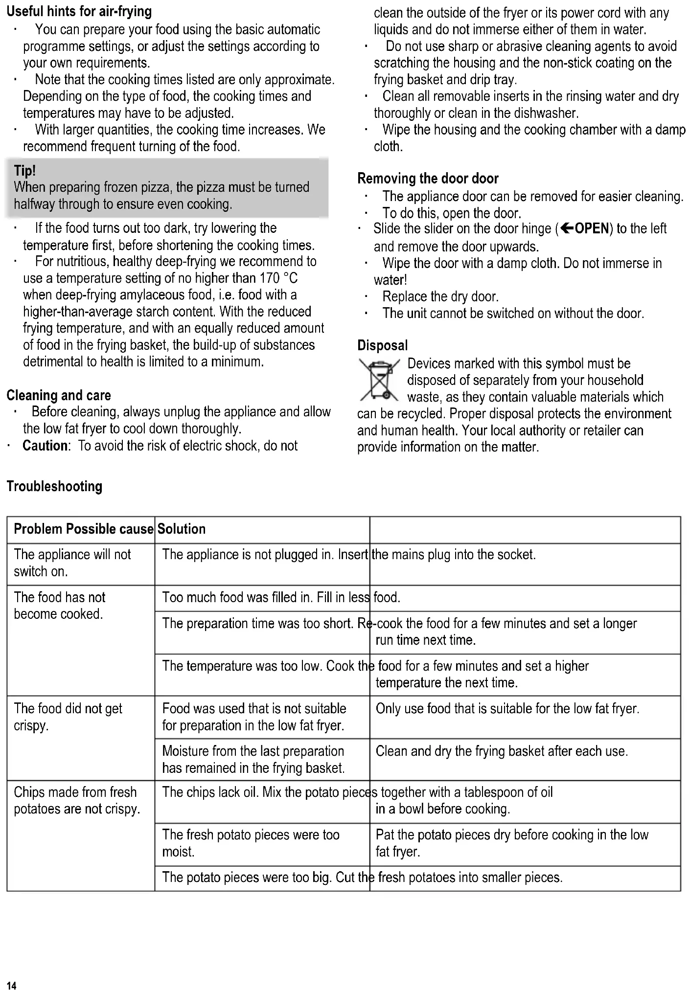 programmes automatiques, étapes 4 à 9. Conseils pratiques pour une friture sans matières grasses ∙ Vous pouvez préparer vos aliments en vous servant des réglages de base du programme automatique ou en modiant les réglages selon vos propres besoins. ∙ Notez que les temps de cuisson indiqués sont approximatifs. En fonction du type d’aliments, les temps de cuisson et températures devront être ajustés. ∙ Le temps de cuisson augmente lorsqu’il s’agit de plus larges quantités. Nous vous conseillons de retourner fréquemment les aliments. Conseil ! Lors de la cuisson de pizzas surgelées, la pizza doit être retournée à mi-cuisson pour garantir que la pizza sera uniformément cuite. ∙ Si les aliments sont trop cuits, choisissez d’abord la température basse avant de réduire le temps de cuisson. ∙ Pour une friture nutritive et saine, nous recommandons d’utiliser une température ne dépassant pas 170 °C pour les aliments amylacés, c’est-à-dire les aliments contenant une quantité d’amidon supérieure à la moyenne. Une température de friture moindre, combinée à une quantité d’aliments également réduite, limite au minimum la formation de substances nuisibles à la santé. Entretien et nettoyage ∙ Avant tout nettoyage, débranchez la friteuse sans huile et laissez-la bien refroidir. ∙ Avertissement : Pour éviter tout risque de choc électrique, ne pas nettoyer l’extérieur de l’appareil ou son cordon d’alimentation avec un liquide quelconque ou les immerger dans l’eau. ∙ N’utilisez pas de détergents agressifs ou abrasifs an de ne pas rayer le boîtier et le revêtement anti-adhésif du panier à friture et de l’égouttoir. ∙ Nettoyez tous les accessoires amovibles à l’eau savonneuse et séchez-les soigneusement, ou mettez- les au lave-vaisselle. ∙ Essuyez le boîtier et la cavité de cuisson avec un chiffon humide. Retirer la porte ∙ An de faciliter le nettoyage, la porte de l’appareil peut être démontée. ∙ Pour ce faire, ouvrez la porte. ∙ Poussez la glissière sur la charnière de la porte (OPEN) vers la gauche et retirez la porte en la tirant vers le haut. ∙ Essuyez la porte avec un chiffon humide. Ne la plongez pas dans l’eau ! ∙ Remontez la porte quand elle est sèche. ∙ L’appareil ne peut pas s’allumer si la porte est démontée. Mise au rebut Les appareils qui portent ce symbole doivent être collectés et traités séparément de vos déchets ménagers, car ils contiennent des matériaux précieux qui peuvent être recyclés. En vous débarrassant correctement de ces appareils, vous contribuez à la prévention de potentiels effets négatifs sur la santé humaine et l’environnement. Votre mairie ou le magasin auprès duquel vous avez acquis l’appareil peuvent vous donner des informations à ce sujet.20 142 x 208 mm Dépannage Problème Cause possible Solution L’appareil ne s’allume pas. L’appareil n’est pas branché. Branchez l’appareil sur la prise de courant. Les aliments ne sont pas cuits. Il y a trop d’aliments dans l’appareil. Mettez moins d’aliments. La durée de cuisson était trop courte. Continuez de cuire les aliments pendant quelques minutes et réglez un temps de cuisson plus long la prochaine fois. La température était trop basse. Continuez de cuire les aliments pendant quelques minutes et réglez une température de cuisson plus élevée la prochaine fois. Les aliments ne sont pas croustillants. Il s’agit d’aliments qui ne sont pas adaptés à la cuisson dans la friteuse sans huile. N’utilisez que des aliments adaptés à la friteuse sans huile. Il reste de l’humidité de la dernière cuisson dans le panier à friture. Après chaque utilisation, nettoyez et séchez le panier à friture. Les frites faites à partir de pommes de terre fraîches ne sont pas croustillantes. Les frites manquent d’huile. Mélangez les frites de pommes de terre avec une cuillère à soupe d’huile dans un récipient avant de les cuire. Les frites de pommes de terre fraîches étaient trop humides. Séchez les frites de pommes de terre avant de les cuire dans la friteuse sans huile. Les frites de pommes de terre étaient trop grosses. Couper les pommes de terre fraîches en frites plus petites.21 142 x 208 mm Hetelucht friteuse Geachte klant, Voordat het apparaat gebruikt wordt, de volgende instructies goed doorlezen en deze handleiding bewaren voor toekomstige raadpleging. Dit apparaat mag alleen gebruikt worden door personen die bekend zijn met de gebruiksaanwijzing. Aansluiting op de netspanning Dit apparaat mag alleen worden aangesloten op een volgens de wet geïnstalleerd geaard stopcontact. Zorg ervoor dat de op het typeplaatje aangegeven spanning overeenkomt met de netspanning. Dit product komt overeen met de richtlijnen aangegeven op het CE-label. Beschrijving