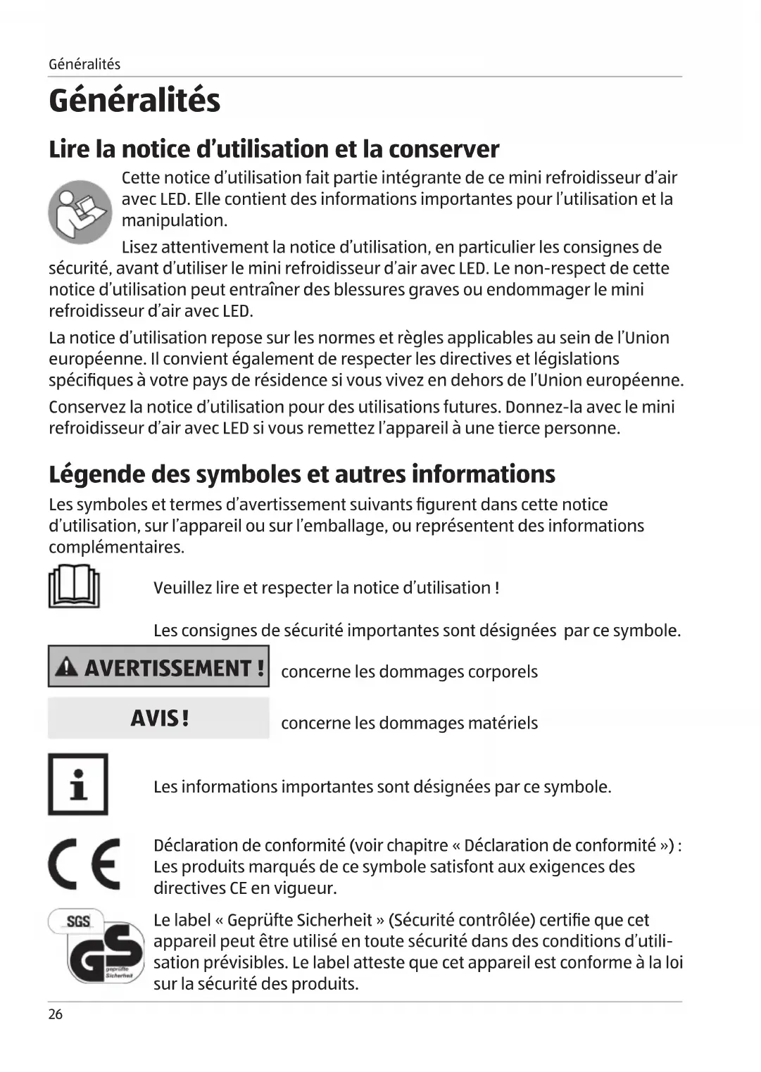 - Élimination de l’appareil Généralités Généralités Lire la notice d’utilisation et la conserver Cette notice d’utilisation fait partie intégrante de ce mini refroidisseur d’air avec LED. Elle contient des informations importantes pour l’utilisation et la manipulation. Lisez attentivement la notice d’utilisation, en particulier les consignes de sécurité, avant d’utiliser le mini refroidisseur d’air avec LED. Le non-respect de cette notice d’utilisation peut entraîner des blessures graves ou endommager le mini refroidisseur d’air avec LED. La notice d’utilisation repose sur les normes et règles applicables au sein de l’Union européenne. Il convient également de respecter les directives et législations spécifiques à votre pays de résidence si vous vivez en dehors de l’Union européenne. Conservez la notice d’utilisation pour des utilisations futures. Donnez-la avec le mini refroidisseur d’air avec LED si vous remettez l’appareil à une tierce personne. Légende des symboles et autresinformations Les symboles et termes d’avertissement suivants figurent dans cette notice d’utilisation, sur l’appareil ou sur l’emballage, ou représentent des informations complémentaires. Veuillez lire et respecter la notice d’utilisation! Les consignes de sécurité importantes sont désignées par ce symbole. AVERTISSEMENT! concerne les dommages corporels AVIS ! concerne les dommages matériels Les informations importantes sont désignées par cesymbole. Déclaration de conformité (voir chapitre «Déclaration de conformité»): Les produits marqués de ce symbole satisfont aux exigences des directives CE en vigueur. Le label «Geprüfte Sicherheit» (Sécurité contrôlée) certifie que cet appareil peut être utilisé en toute sécurité dans des conditions d’utili- sation prévisibles. Le label atteste que cet appareil est conforme à la loi sur la sécurité des produits.27 Généralités / Sécurité Sécurité Utilisation conforme à l’usageprévu Cet appareil est exclusivement conçu pour le refroidissement ou l’humidification de l’air dans des pièces fermées. De plus, l’appareil n’est pas destiné à une utilisation professionnelle mais uniquement à une utilisation privée. Toute autre utili- sation ou modification de l’appareil n’est pas conforme et est strictement interdite. Nous ne pouvons être tenus respon- sables des dommages survenus à la suite d’une utilisation non conforme ou incorrecte. Ce produit est répertorié parmi les appareils accessibles au grand public. Ce symbole indique des appareils électriques qui correspondent à la classe de protection II. Ce symbole fait référence aux prescriptions spéciales en matière d’élimination des appareils usagés (voir le chapitre « Élimination »). N’utilisez l’appareil que dans des pièces fermées. Transformateur de sécurité de type « Fail-Safe » pour la très basse tension de sécurité Alimentation à découpage p. 4026