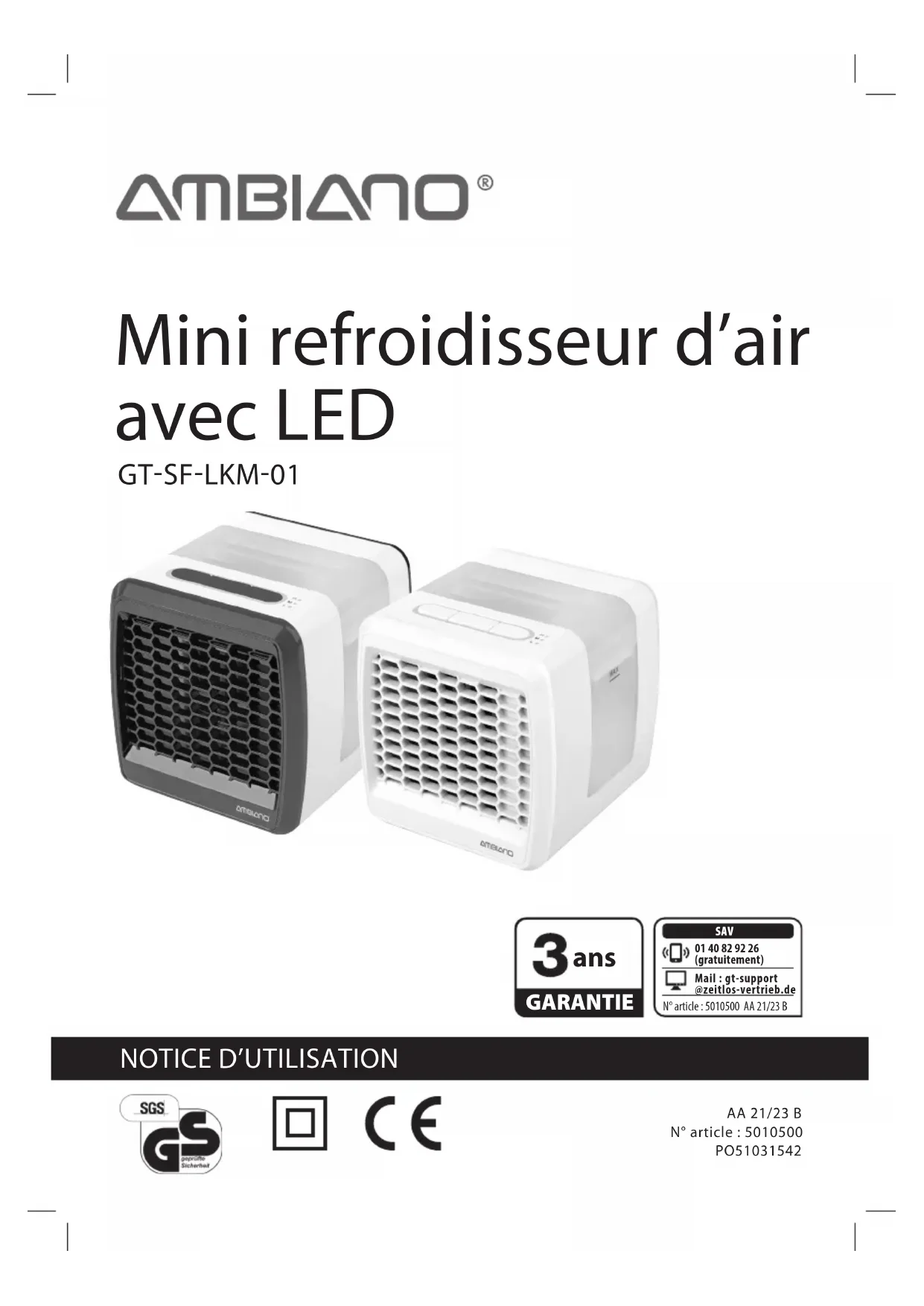 Introduction Nous vous remercions d’avoir choisi le mini refroidisseur d’air avec LED Ambiano. Vous venez d’acquérir un produit de qualité qui satisfait aux normes de performance et de sécurité les plus élevées. An de manipuler cor- rectement l’appareil et de garantir sa longévité, nous vous recommandons de respecter les indications suivantes. Veuillez lire attentivement cette notice d’utilisation et notamment les consignes de sécurité avant la mise en service de l’appareil. Vous y trouverez un certain nombre de recomman- dations importantes et utiles qui doivent être comprises et observées par tous les utilisateurs avant la mise en service. Conservez cette notice d’utilisation et donnez-la avec l’ap- pareil si vous le remettez à une autre personne. Déclaration de conformité UE La déclaration de conformité UE est disponible auprès du constructeur/ importateur. Les produits portant le symbole CE satisfont aux exigences de toutes les directives CE en vigueur. L’appareil répond à la directive sur la sécurité des produits. Ceci est prouvé par le sigle GS de l’institut de contrôle indépendant : Utilisation conforme Cet appareil est exclusivement conçu pour le refroidissement ou l’humidification de l’air dans des pièces fermées. De plus, l’appareil n’est pas destiné à une utilisation professionnelle mais uniquement à une utilisation privée. Toute autre utilisation ou modification de l’appareil n’est pas conforme et est strictement interdite. Nous ne pouvons être tenus respon- sables des dommages survenus à la suite d’une utilisation non conforme ou incorrecte. Ce produit est répertorié parmi les appareils accessibles au grand public. Éditeur de la notice : Globaltronics GmbH & Co. KG Bei den Mühren 5 20457 Hamburg, Allemagne Généralités5