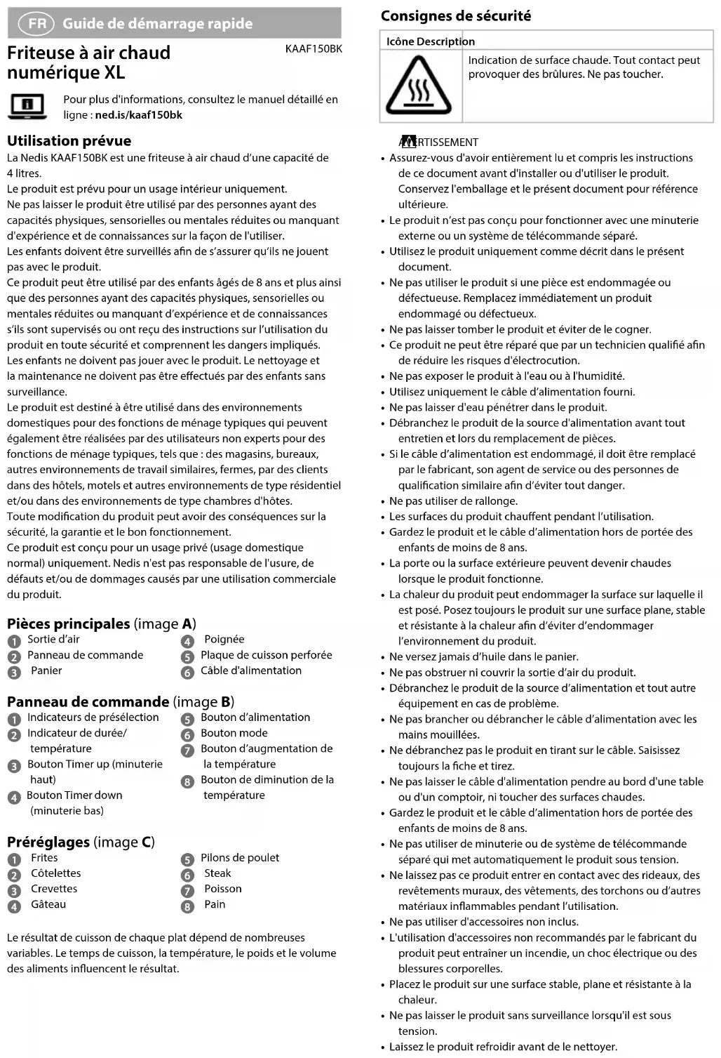 Guide de démarrage rapide Friteuse à air chaud numérique XL KAAF150BKPour plus d'informations, consultez le manuel détaillé en ligne : ned.is/kaaf150bk Utilisation prévue La Nedis KAAF150BK est une friteuse à air chaud d’une capacité de 4litres.Le produit est prévu pour un usage intérieur uniquement.Ne pas laisser le produit être utilisé par des personnes ayant des capacités physiques, sensorielles ou mentales réduites ou manquant d'expérience et de connaissances sur la façon de l'utiliser.Les enfants doivent être surveillés an de s’assurer qu’ils ne jouent pas avec le produit.Ce produit peut être utilisé par des enfants âgés de 8 ans et plus ainsi que des personnes ayant des capacités physiques, sensorielles ou mentales réduites ou manquant d’expérience et de connaissances s’ils sont supervisés ou ont reçu des instructions sur l’utilisation du produit en toute sécurité et comprennent les dangers impliqués. Les enfants ne doivent pas jouer avec le produit. Le nettoyage et la maintenance ne doivent pas être eectués par des enfants sans surveillance.Le produit est destiné à être utilisé dans des environnements domestiques pour des fonctions de ménage typiques qui peuvent également être réalisées par des utilisateurs non experts pour des fonctions de ménage typiques, tels que : des magasins, bureaux, autres environnements de travail similaires, fermes, par des clients dans des hôtels, motels et autres environnements de type résidentiel et/ou dans des environnements de type chambres d'hôtes.Toute modication du produit peut avoir des conséquences sur la sécurité, la garantie et le bon fonctionnement.Ce produit est conçu pour un usage privé (usage domestique normal) uniquement. Nedis n'est pas responsable de l'usure, de défauts et/ou de dommages causés par une utilisation commerciale du produit. Pièces principales (image A)