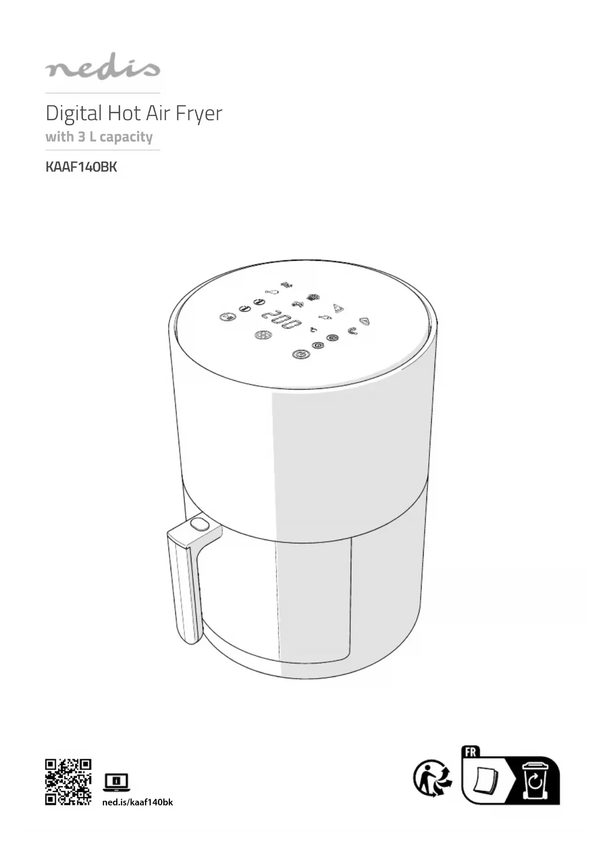 Guide de démarrage rapide Friteuse numérique à air chaud KAAF140BKPour plus d'informations, consultez le manuel détaillé en ligne : ned.is/kaaf140bk Utilisation prévue La KAAF140BK Nedis est une friteuse à air chaud d’une capacité de 3 L. Ce produit est prévu pour un usage intérieur uniquement.Ce produit peut être utilisé par des enfants âgés de 8 ans et plus ainsi que des personnes ayant des capacités physiques, sensorielles ou mentales réduites ou manquant d’expérience et de connaissances s’ils sont supervisés ou ont reçu des instructions sur l’utilisation du produit en toute sécurité et comprennent les dangers impliqués. Les enfants ne doivent pas jouer avec le produit. Le nettoyage et la maintenance ne doivent pas être eectués par des enfants sans surveillance.Le produit est destiné à être utilisé dans des environnements domestiques pour des fonctions de ménage typiques qui peuvent également être réalisées par des utilisateurs non experts pour des fonctions de ménage typiques, tels que : des magasins, bureaux, autres environnements de travail similaires, fermes, par des clients dans des hôtels, motels et autres environnements de type résidentiel et/ou dans des environnements de type chambres d'hôtes.Toute modication du produit peut avoir des conséquences sur la sécurité, la garantie et le bon fonctionnement.Ce produit est conçu pour un usage privé (usage domestique normal) uniquement. Nedis n'est pas responsable de l'usure, de défauts et/ou de dommages causés par une utilisation commerciale du produit. Pièces principales (image A) 1 Sortie d’air2 Panneau de commande3 Poignée4 Déverrouillage du panier5 Panier6 Plateau7 Câble d'alimentation7