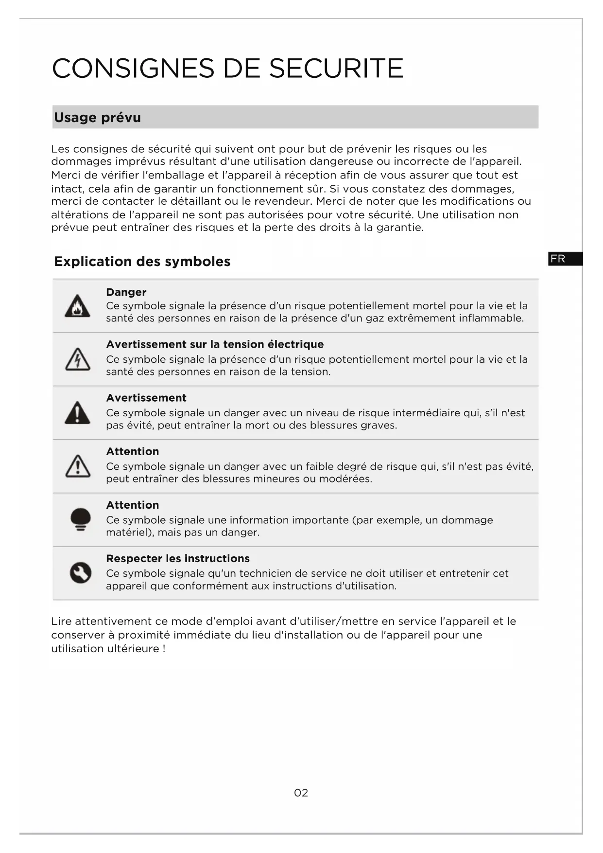 Les consignes de sécurité qui suivent ont pour but de prévenir les risques ou les dommages imprévus résultant d'une utilisation dangereuse ou incorrecte de l'appareil. Merci de vérifier l'emballage et l'appareil à réception afin de vous assurer que tout est intact, cela afin de garantir un fonctionnement sûr. Si vous constatez des dommages, merci de contacter le détaillant ou le revendeur. Merci de noter que les modifications ou altérations de l'appareil ne sont pas autorisées pour votre sécurité. Une utilisation non prévue peut entraîner des risques et la perte des droits à la garantie. Ce symbole signale la présence d’un risque potentiellement mortel pour la vie et la santé des personnes en raison de la présence d'un gaz extrêmement inflammable. Ce symbole signale la présence d’un risque potentiellement mortel pour la vie et la santé des personnes en raison de la tension. Ce symbole signale un danger avec un niveau de risque intermédiaire qui, s'il n'est pas évité, peut entraîner la mort ou des blessures graves. Ce symbole signale un danger avec un faible degré de risque qui, s'il n'est pas évité, peut entraîner des blessures mineures ou modérées. Ce symbole signale une information importante (par exemple, un dommage matériel), mais pas un danger. Ce symbole signale qu'un technicien de service ne doit utiliser et entretenir cet appareil que conformément aux instructions d'utilisation. Lire attentivement ce mode d'emploi avant d'utiliser/mettre en service l'appareil et le conserver à proximité immédiate du lieu d'installation ou de l'appareil pour une utilisation ultérieure !