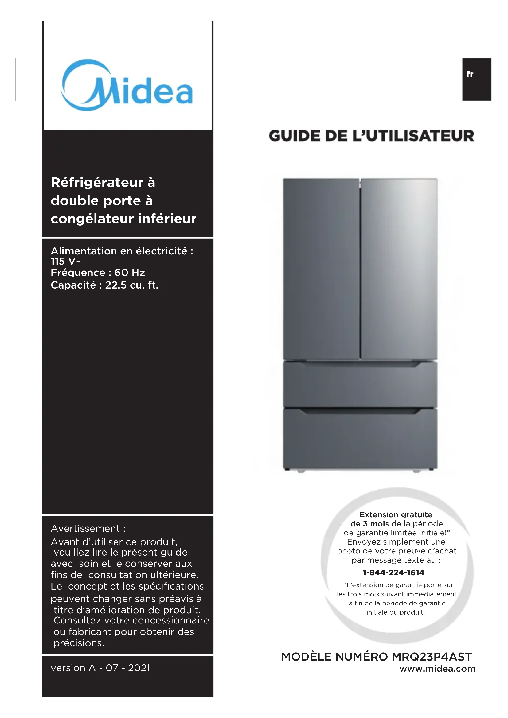 Avant d’utiliser ce produit, veuillez lire le présent guide avec soin et le conserver aux fins de consultation ultérieure. Le concept et les spécifications peuvent changer sans préavis à titre d’amélioration de produit. Consultez votre concessionnaire ou fabricant pour obtenir des précisions. version A - 07 - 2021 MODÈLE NUMÉRO MRQ23P4AST www.midea.com Extension gratuite de 3 mois de la période de garantie limitée initiale!* Envoyez simplement une photo de votre preuve d’achat par message texte au :1-844-224-1614*L’extension de garantie porte sur les trois mois suivant immédiatement la fin de la période de garantie initiale du produit.Cher utilisateur MERCI et FÉLICITATIONS de votre achat de ce produit Midea de première qualité. Votre réfrigérateur Midea est conçue pour des performances fiables et sans problèmes. Veuillez prendre quelques instants pour enregis trer votre nouveau réfrigérateur. Enregistrez votre nouveau réfrigérateur sur www.midea.com à l’onglet Support [Soutien]. Pour référence ultérieure, prenez note des numéros de modèle et de série qui sont indiqués à l’arrière du réfrigérateur, au-dessus du compartiment du compresseur. Numéro de modèle ____________________________________ Numéro de série _______________________________________