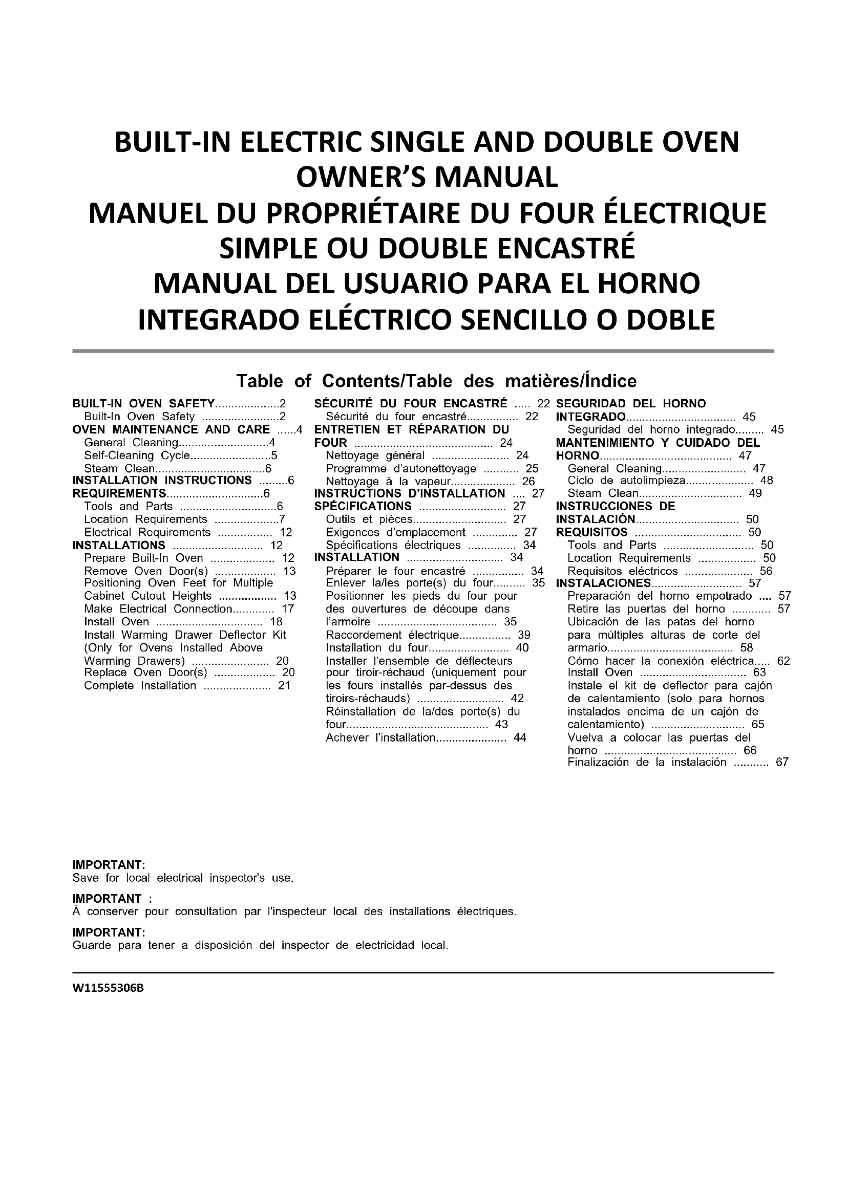 SPÉCIFICATIONS Outils et pièces Rassembler les outils et pièces nécessaires avant d’entreprendre l’installation. Lire et observer les instructions fournies avec chacun des outils de la liste ci-dessous. Outils nécessaires ■ Tournevis à tête cruciforme ■ Ruban à mesurer ■ Perceuse manuelle ou électrique (pour installation dans une armoire) ■ Foret de 1 po (2,5 cm) (pour installation dans une armoire) ■ Niveau ■ Tournevis à tête plate Pièces nécessaires ■ Connecteur de conduit (homologation UL ou CSA) ■ Connecteurs de fils (homologation UL) ■ Ensemble de déflecteurs pour tiroir-réchaud (pour les fours installés par-dessus un tiroir-réchaud) : Voir la section des informations de commande en ligne du guide de démarrage rapide. Pièces fournies ■ Vis no 8-14 x 3/4 po (1,9 cm) – four simple (2), four double (4) ■ Vis à tête cruciforme no 8-18 x 3/8 po (9,5 mm) – garniture de l’évent inférieur (2) ■ Vis à tête cruciforme no 8-18 x 3/8 po (9,5 mm) – plaque de protection de l’évent inférieur (2) ■ Vis à tête hexagonale no 8-18 x 3/8 po (9,5 mm) – pieds (4) ■ Pieds arrière – four double (2) ■ Pieds avant – four double (2) ■ Évent inférieur et protecteur Consulter les codes locaux. Vérifier l’alimentation électrique existante. Voir la section « Spécifications électriques ». Il est recommandé de faire réaliser tous les raccordements électriques par un électricien qualifié agréé. REMARQUE : S’assurer d’acheter uniquement des pièces et des accessoires Whirlpool certifiés par le fabricant de l’appareil. Il se peut que l’installation nécessite des pièces supplémentaires. Pour commander, consulter les coordonnées indiquées dans le guide de démarrage rapide. Exigences d’emplacement IMPORTANT : Observer les dispositions de tous les codes et règlements en vigueur. ■ Pour éliminer les risques de brûlure ou d’incendie en se penchant au-dessus d’une surface qui chauffe, il est déconseillé d’utiliser l’espace de rangement des armoires situées au-dessus de l’appareil. Si des armoires de rangement sont envisagées, le risque peut être réduit par l’installation d’une hotte de cuisinière dépassant le bas des armoires d’au moins 5 po (12,7 cm) horizontalement. ■ Respecter les dimensions indiquées pour les ouvertures à découper dans les armoires. Ces dimensions tiennent compte des dégagements de séparation nécessaires pour le four. ■ L’espace d’installation dans un encastrement doit permettre la formation d’une enceinte complète autour de la partie encastrée du four. ■ Une source d’électricité avec liaison à la terre est nécessaire. Voir la section « Spécifications électriques ». ■ Le boîtier de connexion doit être situé 3 po (7,6 cm) maximum au-dessous de la surface d’appui lorsque le four est installé dans une armoire murale. Un trou d’un diamètre minimum de 1 po (2,5 cm) doit avoir été percé dans l’angle arrière gauche ou arrière droit de la surface de support pour le passage du câble d’alimentation de l’appareil jusqu’au boîtier de connexion. REMARQUE : Pour l’installation sous un comptoir, on recommande que le boîtier de connexion soit situé dans l’armoire adjacente, à droite ou à gauche. Si le boîtier de connexion est installé sur le mur derrière le four, nous recommandons qu’il soit encastré et situé dans la partie supérieure centrale de l’armoire. ■ La surface de support du four doit être robuste, horizontale et en affleurement avec le bas de l’ouverture découpée dans l’armoire. ■ Pour un modèle simple de 30 po (76,2 cm), le plancher doit pouvoir supporter un poids de 200 lb (91 kg).28 ■ Pour un modèle double de 30 po (76,2 cm), le plancher doit pouvoir supporter un poids de 330 lb (150 kg). IMPORTANT : Pour éviter d’endommager les armoires, consulter le constructeur de la maison ou le fabricant des armoires pour déterminer si les matériaux utilisés peuvent subir un changement de couleur, une déstratification ou d’autres dommages. Ce four a été conçu conformément aux exigences des normes UL et CSA International et respecte les températures maximales permises de 194 °F (90 °C) pour les armoires en bois. Installation sous un comptoir (avec table de cuisson installée au-dessus) : Les fours homologués pour ce type d’installation comportent une étiquette d’homologation placée sur le dessus du four. Consulter la section « Four installé sous la table de cuisson – Dimensions pour l’ouverture à découper ». Dimensions de l’armoire – Four simple, installation standard Four simple sous le comptoir (sans table de cuisson au- dessus) Modèles de 27 po (68,6 cm) A. 27 po (68,6 cm) de largeur minimum pour l’armoire B. 1