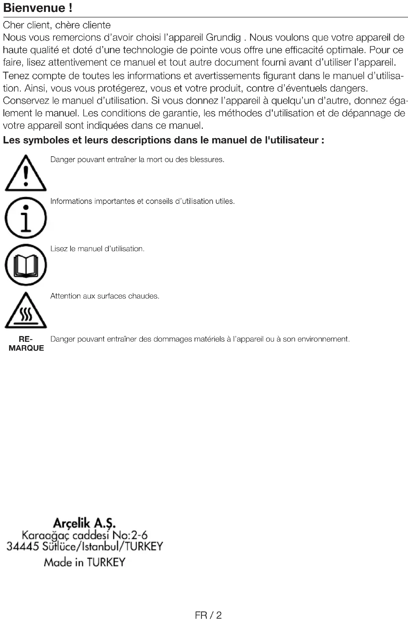NLFR / 2 Bienvenue! Cher client, chère cliente Nous vous remercions d’avoir choisi l’appareil Grundig . Nous voulons que votre appareil de haute qualité et doté d’une technologie de pointe vous offre une efficacité optimale. Pour ce faire, lisez attentivement ce manuel et tout autre document fourni avant d’utiliser l’appareil. Tenez compte de toutes les informations et avertissements figurant dans le manuel d’utilisa- tion. Ainsi, vous vous protégerez, vous et votre produit, contre d’éventuels dangers. Conservez le manuel d’utilisation. Si vous donnez l’appareil à quelqu’un d’autre, donnez éga- lement le manuel. Les conditions de garantie, les méthodes d'utilisation et de dépannage de votre appareil sont indiquées dans ce manuel. Les symboles et leurs descriptions dans le manuel de l'utilisateur : Danger pouvant entraîner la mort ou des blessures. Informations importantes et conseils d’utilisation utiles. Lisez le manuel d’utilisation. Attention aux surfaces chaudes. RE- MARQUE Danger pouvant entraîner des dommages matériels à l’appareil ou à son environnement.FR / 3 Table des matières 1 Consignes de sécurité.................. 4