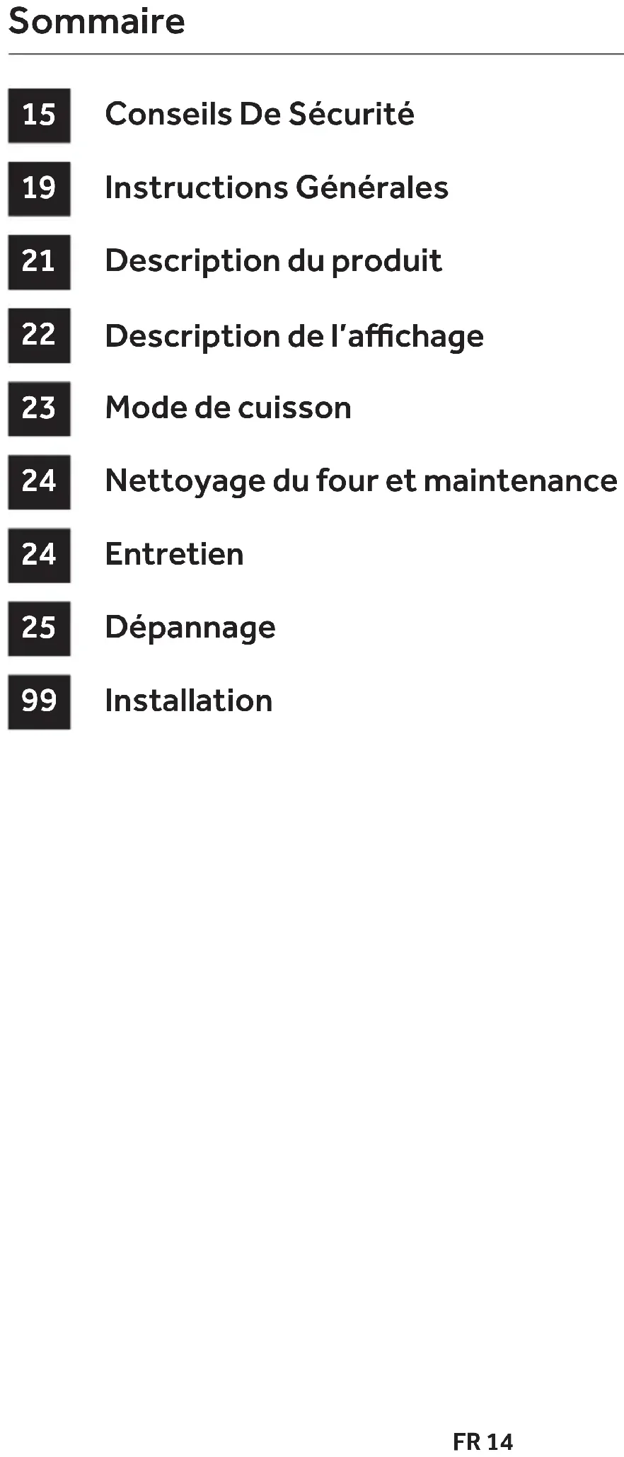 MENT Lorsque cela est possible, éviter le préchauage du four et éviter de le faire tourn- er à vide. N’ouvrez la porte du four que lorsque cela est nécessaire, car il y a des déperditions de chaleur à chaque fois qu’il est ouvert. Pour une économie d’énergie signicative, étein- dre le four entre 5 et 10 minutes avant la n de cuisson prévue, et utiliser la chaleur que le four continue de générer. Gardez les joints propres et en bon état, pour éviter toute déperdition d’énergie. Si vous avez un contrat électrique avec un tarif heure creuse, le programme “cuisson diérée” peut vous faire réaliser des économies d’énergie en déplaçant le début du programme à un intervalle de temps à tarif réduit.IT 26 Indicazioni di Sicurezza Avvertenze Generali Descrizione del Prodotto Descrizione del display Modalità di cottura Pulizia e manutenzione del forno Manutenzione Risoluzione dei Problemi Garanzie Installation Sommario