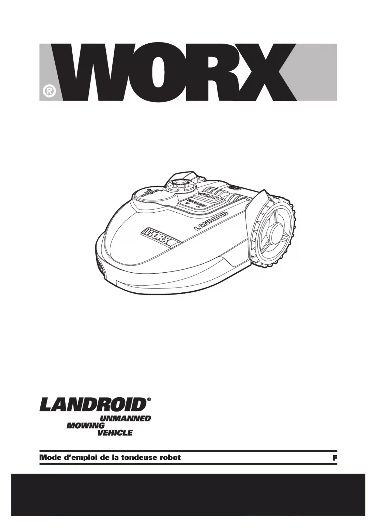 rebut séparément. j) N’utilisez pas d’autre chargeur que celui spécifié par WORX. N'utilisez pas d'autre chargeur que celui spécifiquement fourni avec l'appareil. Un chargeur destiné à un type de batterie donné peut être à l’origine d’un incendie s’il est utilisé avec une autre batterie. k) N'utilisez en aucun cas une batterie autre que celle prévue pour cet appareil. l) La batterie doit être tenue hors de portée des enfants. m) Gardez la documentation d'origine du produit afin de pouvoir vous y référer ultérieurement. n) Respectez les procédures de mise au rebut.Mode d’emploi de la tondeuse robot F