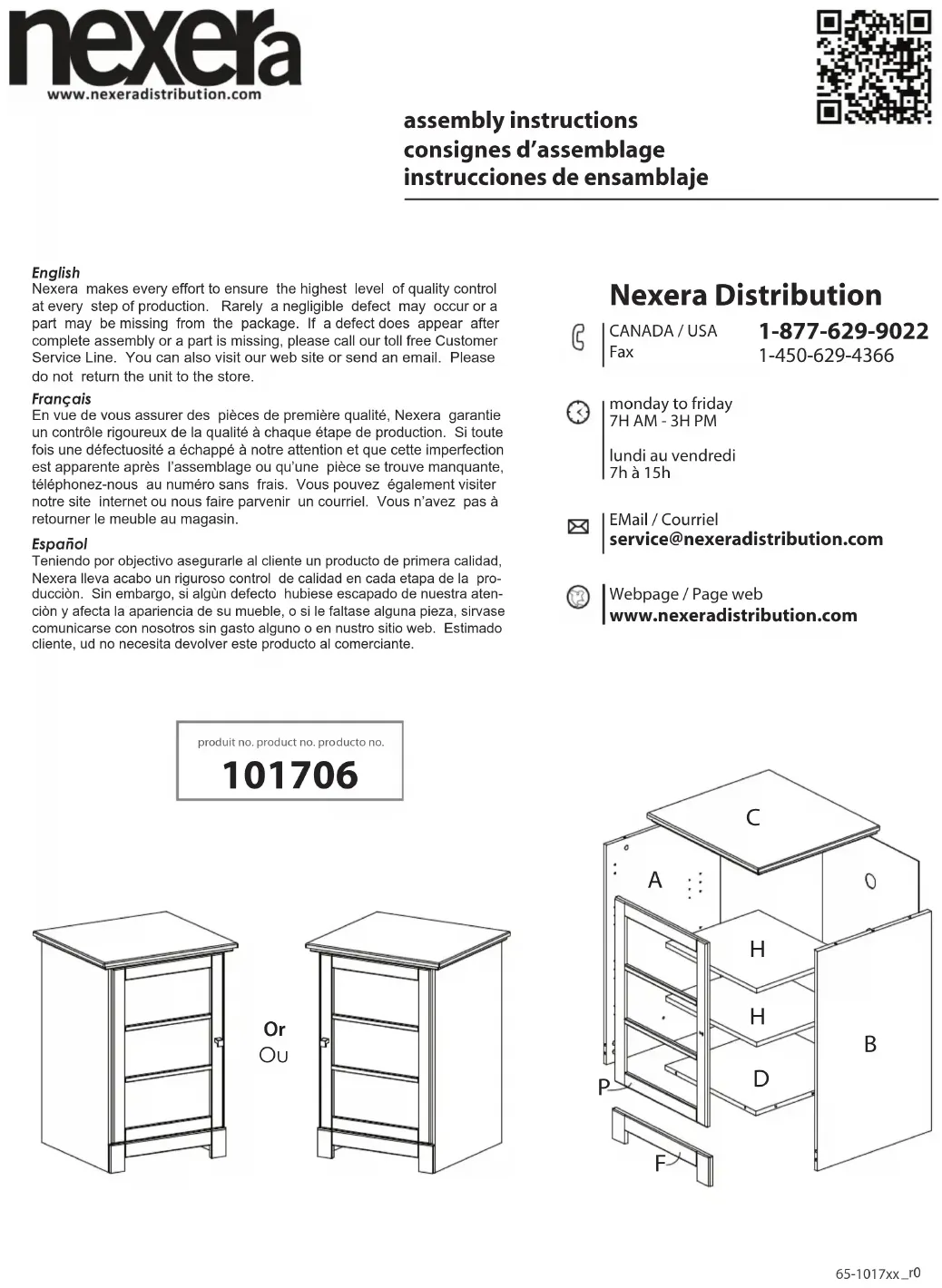 ovince differ from the above, it will not apply. Garantie limitée de 1 an Tous les produits Nexera sont garantis à l’acheteur original contre toutes défectuosités de matériel ou de fabrication pour une période de 1 an à partir de la date d’achat. Le mot ‘’défectuosités’’ utilisé dans cette garantie signifie toutes imperfections pouvant nuire à l’utilisation du meuble ou du produit pour lequel il a été conçu. Cette garantie est expressément limitée au remplacement des pièces ou composantes défectueuses, sujet à la disponibilité des stocks. La main d’œuvre de l’assemblage est exclue. Cette garantie s’applique dans des conditions d’utilisation normales. Elle ne couvre pas des défectuosités résultant d’un assemblage ou désassemblage défaillant, modification du produit, dommages intentionnels, abus, usage impropre, accidents, négligence ou des expositions aux éléments extérieurs. Nos meubles ne sont pas destinés pour une utilisation à l’extérieure. Cette garantie s’applique uniquement au Canada et aux États-Unis. Nexera se réserve le droit d’exiger une preuve d’achat ou toutes autres pièces justificatives pour valider cette garantie. Cette garantie est limitative quant à la responsabilité de Nexera et donne à l’acheteur original des droits spécifiques. Toute garantie législative prévalant dans votre lieu de résidence est limitée à une période de 1 an. Advenant le cas que la législation de votre lieu de résidence diffère de celle-ci, elle ne s’applique s’appliquera pas. Garantia limitada de 1 año NexeraI garantiza todos sus productos contra defectos en materiales y mano de obra por un periodo de 1 año a partir de la fecha original de la compra. Para efectos de esta garantía, “defecto” significa toda imperfección que puede perjudicar el uso del mueble o el producto para el que fue concebido. Esta garantía se limita expresamente al reemplazo de las partes defectuosas o sus componentes, según las disponibilidades. No incluye la mano de obra del ensamblaje. Esta garantía se aplica en condiciones de uso normal. No cubre los defectos causados por ensamblaje o desensamblaje inapropiados, modificación del producto, daño intencional, abuso, mal uso, accidente, negligencia o exposición a elementos exteriores. Nuestros productos no deben usarse al exterior. Esta garantía se aplica únicamente en Canadá y Estados Unidos. Nexera se reserva el derecho de exigir pruebas de compra al vendedor autorizado o toda otra prueba para validar esta garantía. Esta garantía es explicita en cuanto a las limitaciones de responsabilidad de Nexera y otorga al comprador original derechos específicos. Toda garantía jurídica en su provincia o estado de residencia se a 1 año