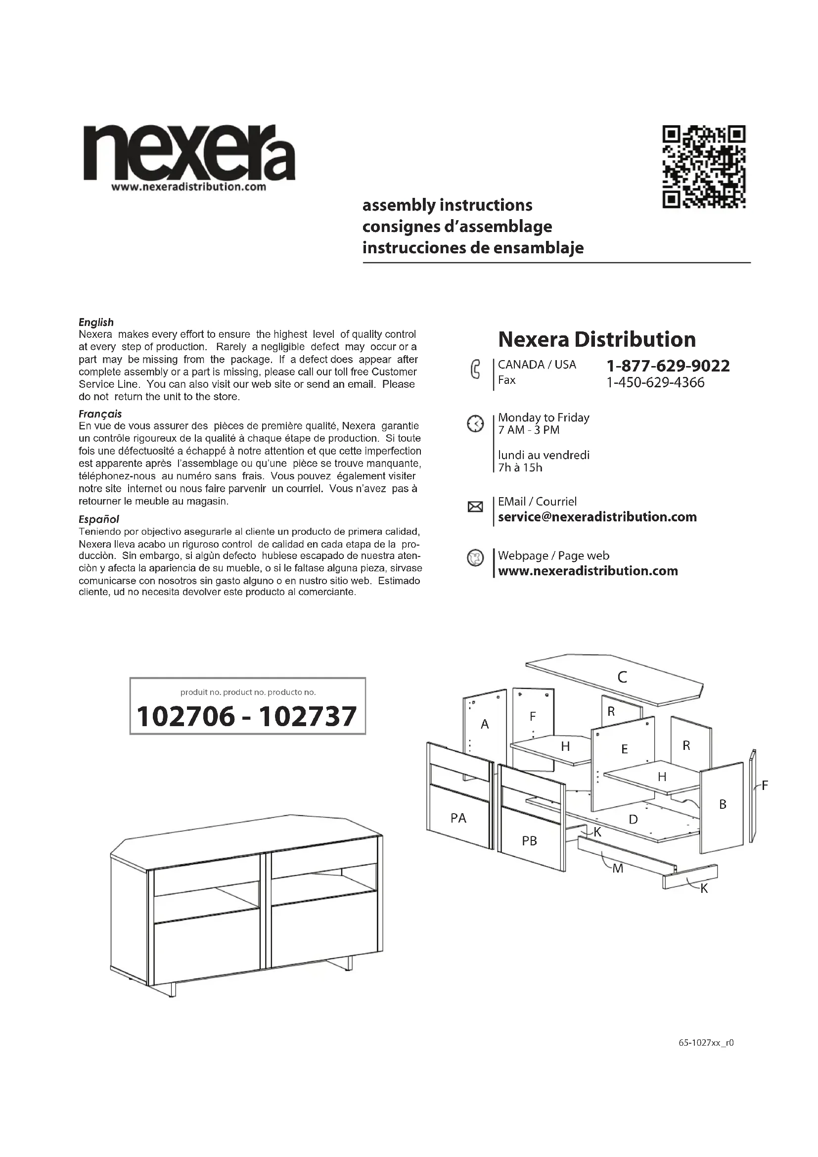 ovince differ from the above, it will not apply. Garantie limitée de 1 an Tous les produits Nexera sont garantis à l’acheteur original contre toutes défectuosités de matériel ou de fabrication pour une période de 1 an à partir de la date d’achat. Le mot ‘’défectuosités’’ utilisé dans cette garantie signifie toutes imperfections pouvant nuire à l’utilisation du meuble ou du produit pour lequel il a été conçu. Cette garantie est expressément limitée au remplacement des pièces ou composantes défectueuses, sujet à la disponibilité des stocks. La main d’œuvre de l’assemblage est exclue. Cette garantie s’applique dans des conditions d’utilisation normales. Elle ne couvre pas des défectuosités résultant d’un assemblage ou désassemblage défaillant, modification du produit, dommages intentionnels, abus, usage impropre, accidents, négligence ou des expositions aux éléments extérieurs. Nos meubles ne sont pas destinés pour une utilisation à l’extérieure. Cette garantie s’applique uniquement au Canada et aux États-Unis. Nexera se réserve le droit d’exiger une preuve d’achat ou toutes autres pièces justificatives pour valider cette garantie. Cette garantie est limitative quant à la responsabilité de Nexera et donne à l’acheteur original des droits spécifiques. Toute garantie législative prévalant dans votre lieu de résidence est limitée à une période de 1 an. Advenant le cas que la législation de votre lieu de résidence diffère de celle-ci, elle ne s’applique s’appliquera pas. Garantia limitada de 1 año NexeraI garantiza todos sus productos contra defectos en materiales y mano de obra por un periodo de 1 año a partir de la fecha original de la compra. Para efectos de esta garantía, “defecto” significa toda imperfección que puede perjudicar el uso del mueble o el producto para el que fue concebido. Esta garantía se limita expresamente al reemplazo de las partes defectuosas o sus componentes, según las disponibilidades. No incluye la mano de obra del ensamblaje. Esta garantía se aplica en condiciones de uso normal. No cubre los defectos causados por ensamblaje o desensamblaje inapropiados, modificación del producto, daño intencional, abuso, mal uso, accidente, negligencia o exposición a elementos exteriores. Nuestros productos no deben usarse al exterior. Esta garantía se aplica únicamente en Canadá y Estados Unidos. Nexera se reserva el derecho de exigir pruebas de compra al vendedor autorizado o toda otra prueba para validar esta garantía. Esta garantía es explicita en cuanto a las limitaciones de responsabilidad de Nexera y otorga al comprador original derechos específicos. Toda garantía jurídica en su provincia o estado de residencia se a 1 año