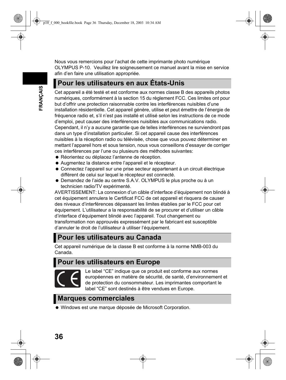 Nous vous remercions pour l'achat de cette imprimante photo numérique OLYMPUS P-10. Veuillez dire soigneusement ce manuel avant la mise en service afin d'en faire une utilisation appropriée.