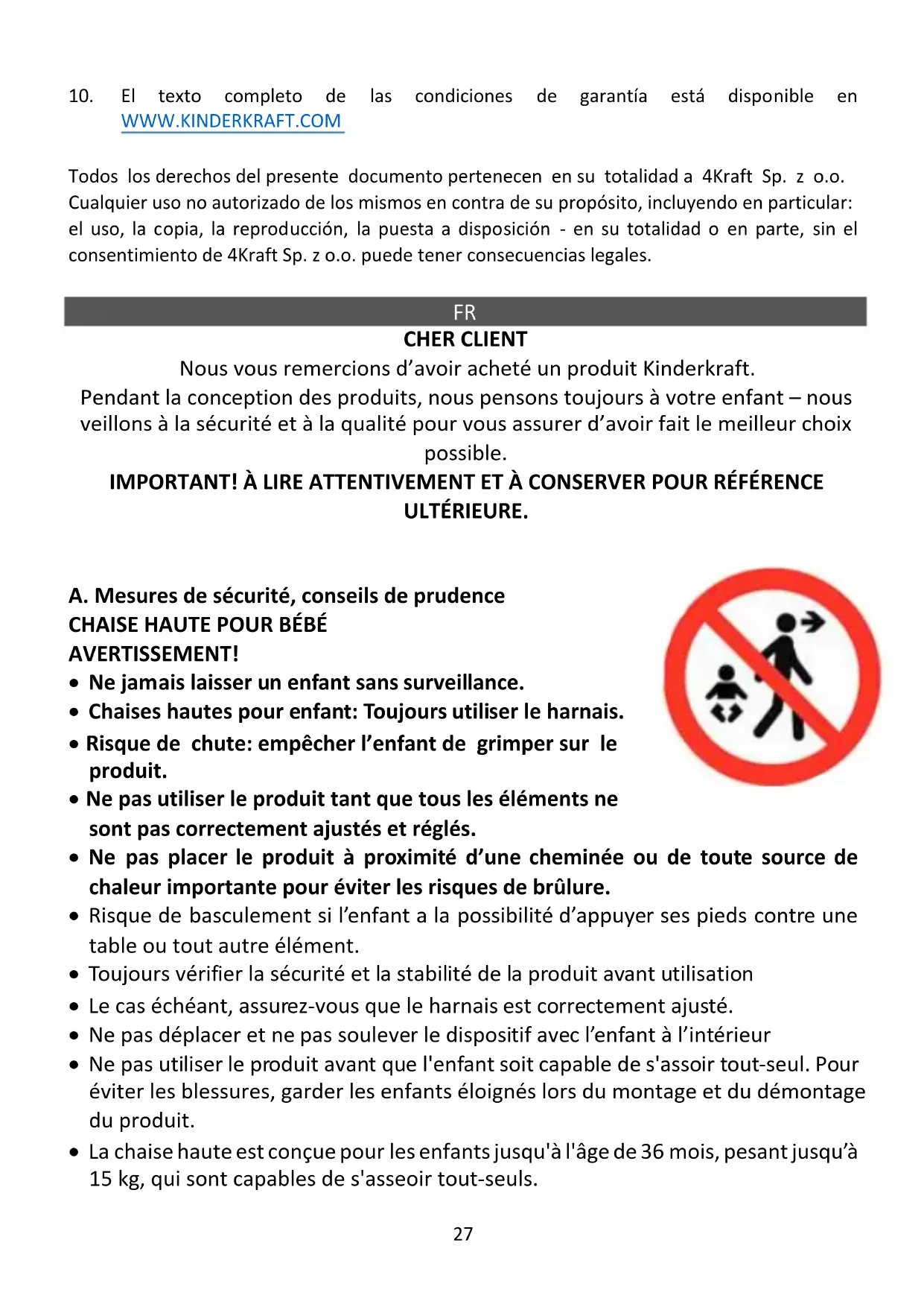 CHER CLIENT Nous vous remercions d’avoir acheté un produit Kinderkraft. Pendant la conception des produits, nous pensons toujours à votre enfant – nous veillons à la sécurité et à la qualité pour vous assurer d’avoir fait le meilleur choix possible. IMPORTANT! À LIRE ATTENTIVEMENT ET À CONSERVER POUR RÉFÉRENCE ULTÉRIEURE.