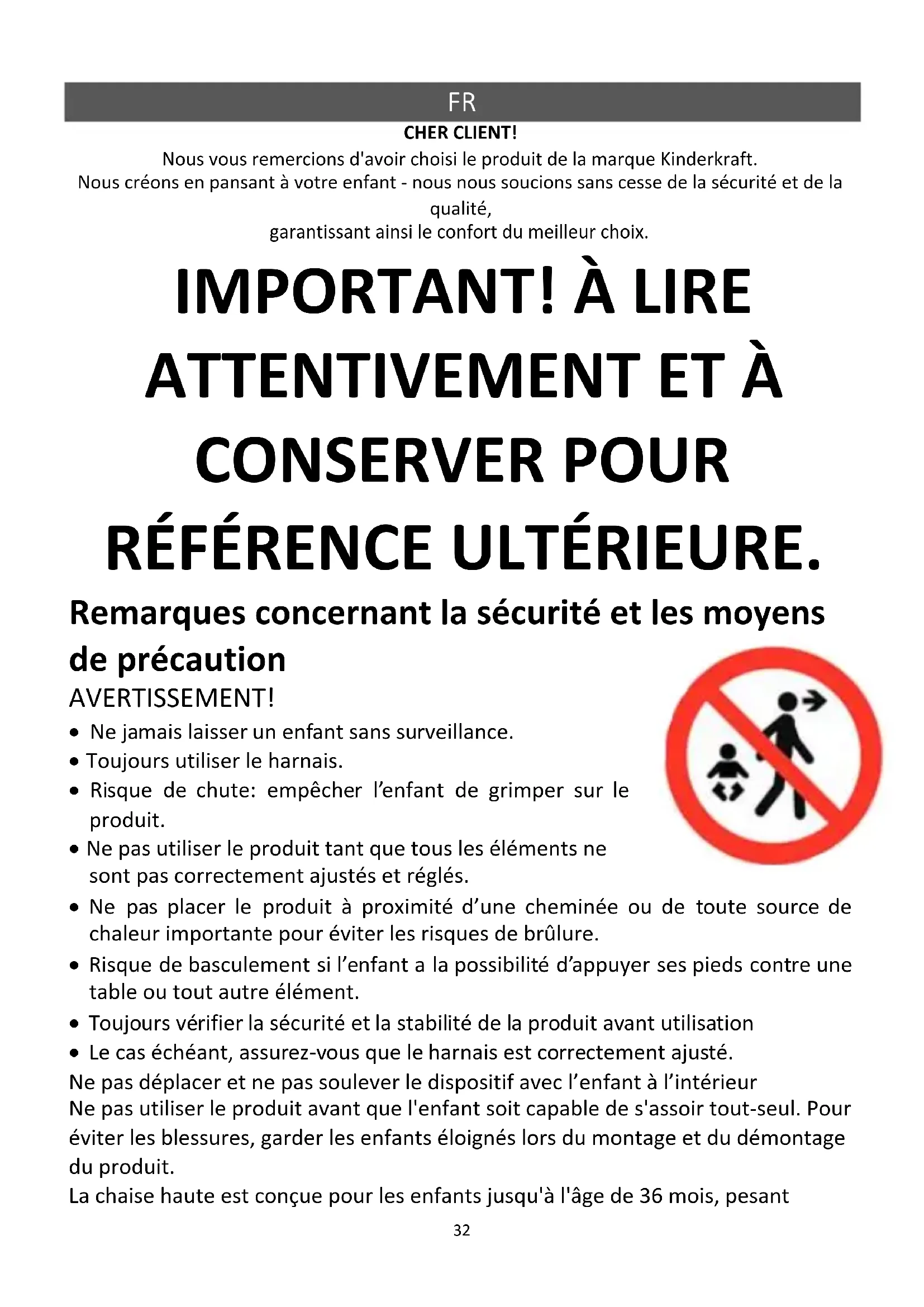 CHER CLIENT! Nous vous remercions d'avoir choisi le produit de la marque Kinderkraft. Nous créons en pansant à votre enfant - nous nous soucions sans cesse de la sécurité et de la qualité, garantissant ainsi le confort du meilleur choix. IMPORTANT! À LIRE ATTENTIVEMENT ET À CONSERVER POUR RÉFÉRENCE ULTÉRIEURE. Remarques concernant la sécurité et les moyens de précaution AVERTISSEMENT!
