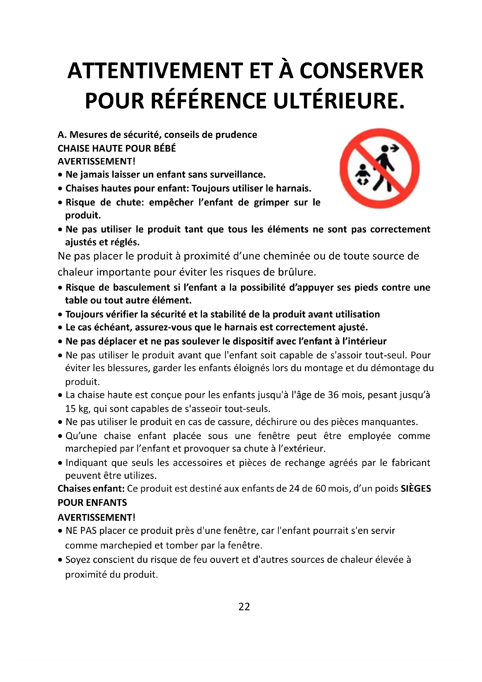 - Risque de chute: empêcher l’enfant de grimper sur le produit.