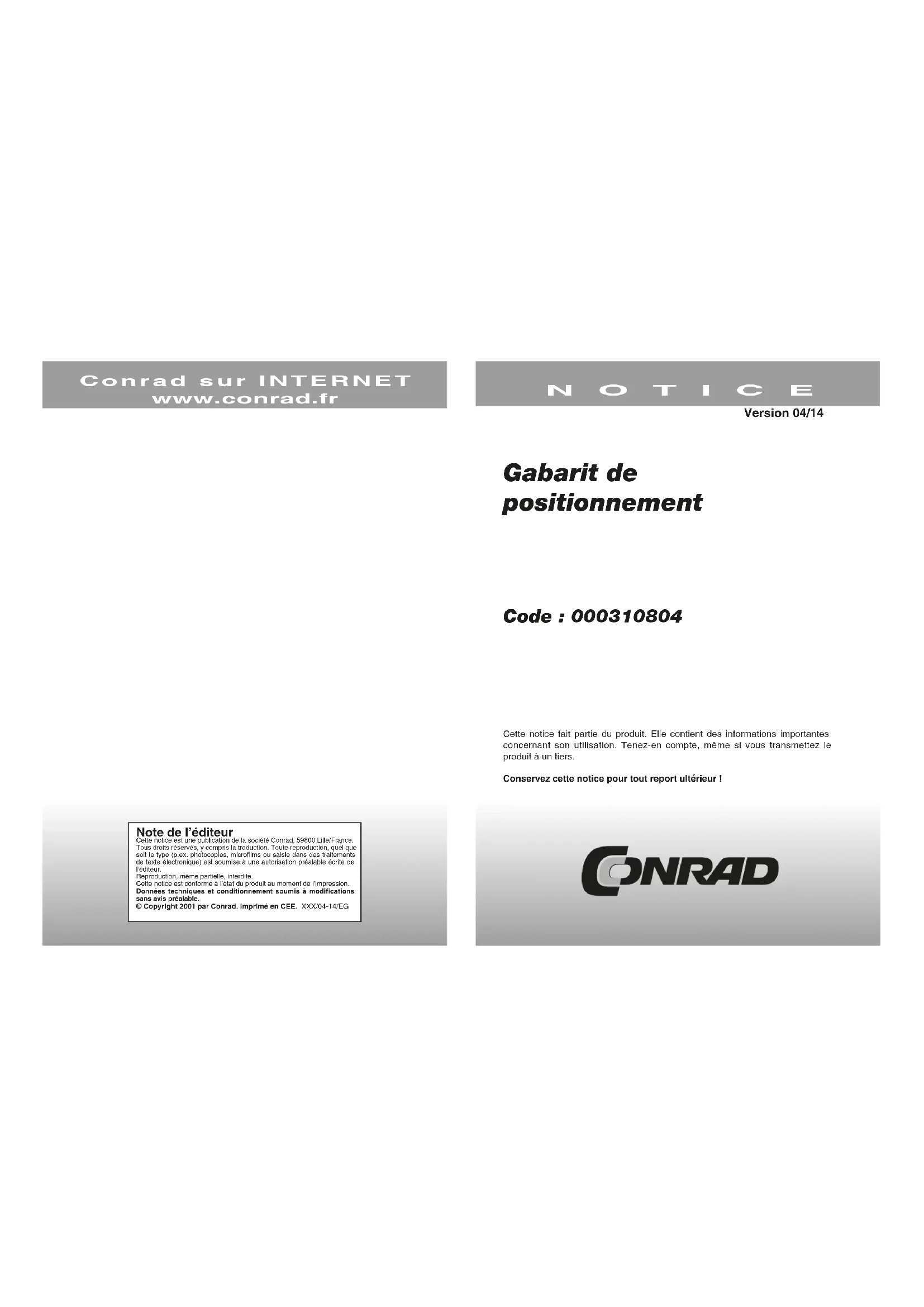 Note de l’éditeur Cette notice est une publication de la société Conrad, 59800 Lille/France.Tous droits réservés, y compris la traduction. Toute reproduction, quel que soit le type (p.ex. photocopies, microfilms ou saisie dans des traitements de texte électronique) est soumise à une autorisation préalable écrite de l’éditeur.Reproduction, même partielle, interdite.Cette notice est conforme à l’état du produit au moment de l’impression.Données techniques et conditionnement soumis à modifications sans avis préalable.© Copyright 2001 par Conrad. Imprimé en CEE. XXX/04-14/EG Gabarit de positionnement Code : 000310804 Cette notice fait partie du produit. Elle contient des informations importantes concernant son utilisation. Tenez-en compte, même si vous transmettez le produit à un tiers. Conservez cette notice pour tout report ultérieur ! NOTICE Conrad sur INTERNET www.conrad.fr Version 04/142 3 Gabarit de positionnement pour un montage précis du système de balayage sur un bras de lecture, visant à réduire au maximum les erreurs de balayage et obtenir ainsi de meilleurs résultats de lecture. Il s’utilise comme suit : Placez le gabarit sur la platine fixée en utilisant l’axe du disque et orientez le vers le bras de lecture. Point de mesure «B» - coude