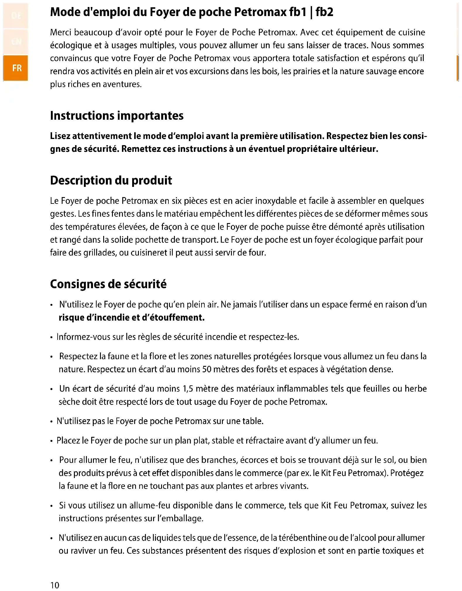 Mode d'emploi du Foyer de poche Petromax fb1 | fb2 Merci beaucoup d’avoir opté pour le Foyer de Poche Petromax. Avec cet équipement de cuisine écologique et à usages multiples, vous pouvez allumer un feu sans laisser de traces. Nous sommes convaincus que votre Foyer de Poche Petromax vous apportera totale satisfaction et espérons qu’il rendra vos activités en plein air et vos excursions dans les bois, les prairies et la nature sauvage encore plus riches en aventures. Instructions importantes Lisez attentivement le mode d‘emploi avant la première utilisation. Respectez bien les consi- gnes de sécurité. Remettez ces instructions à un éventuel propriétaire ultérieur. Description du produit Le Foyer de poche Petromax en six pièces est en acier inoxydable et facile à assembler en quelques gestes. Les fines fentes dans le matériau empêchent les différentes pièces de se déformer mêmes sous des températures élevées, de façon à ce que le Foyer de poche puisse être démonté après utilisation et rangé dans la solide pochette de transport. Le Foyer de poche est un foyer écologique parfait pour faire des grillades, ou cuisineret il peut aussi servir de four. Consignes de sécurité