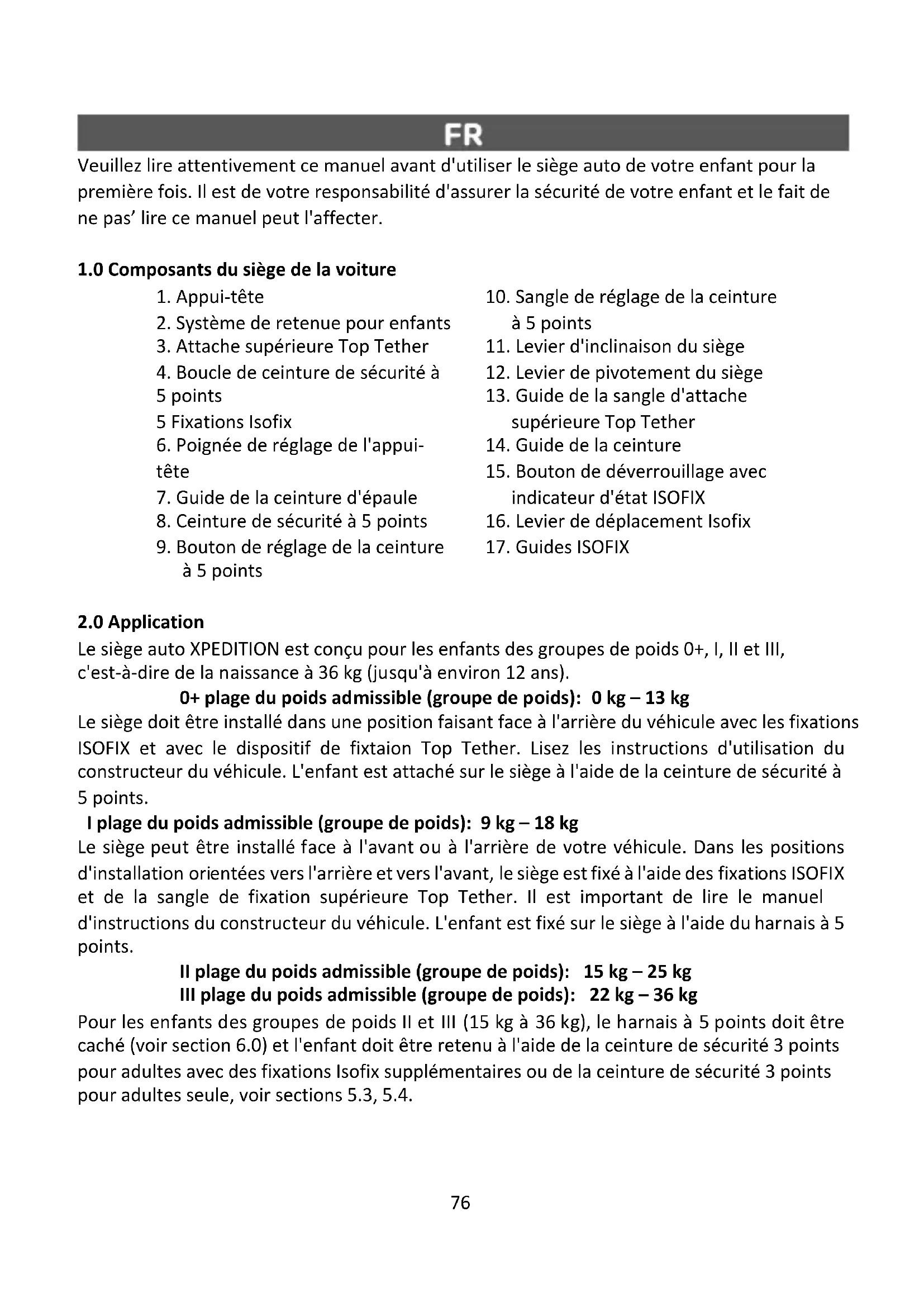 Le siège auto XPEDITION est conçu pour les enfants des groupes de poids 0+, I, II et III, c'est-à-dire de la naissance à 36 kg (jusqu'à environ 12 ans). 0+ plage du poids admissible (groupe de poids): 0 kg – 13 kg Le siège doit être installé dans une position faisant face à l'arrière du véhicule avec les fixations ISOFIX et avec le dispositif de fixtaion Top Tether. Lisez les instructions d'utilisation du constructeur du véhicule. L'enfant est attaché sur le siège à l'aide de la ceinture de sécurité à 5 points. I plage du poids admissible (groupe de poids): 9 kg – 18 kg Le siège peut être installé face à l'avant ou à l'arrière de votre véhicule. Dans les positions d'installation orientées vers l'arrière et vers l'avant, le siège est fixé à l'aide des fixations ISOFIX et de la sangle de fixation supérieure Top Tether. Il est important de lire le manuel d'instructions du constructeur du véhicule. L'enfant est fixé sur le siège à l'aide du harnais à 5 points. II plage du poids admissible (groupe de poids): 15 kg – 25 kg III plage du poids admissible (groupe de poids): 22 kg – 36 kg Pour les enfants des groupes de poids II et III (15 kg à 36 kg), le harnais à 5 points doit être caché (voir section 6.0) et l'enfant doit être retenu à l'aide de la ceinture de sécurité 3 points pour adultes avec des fixations Isofix supplémentaires ou de la ceinture de sécurité 3 points pour adultes seule, voir sections 5.3, 5.4.77