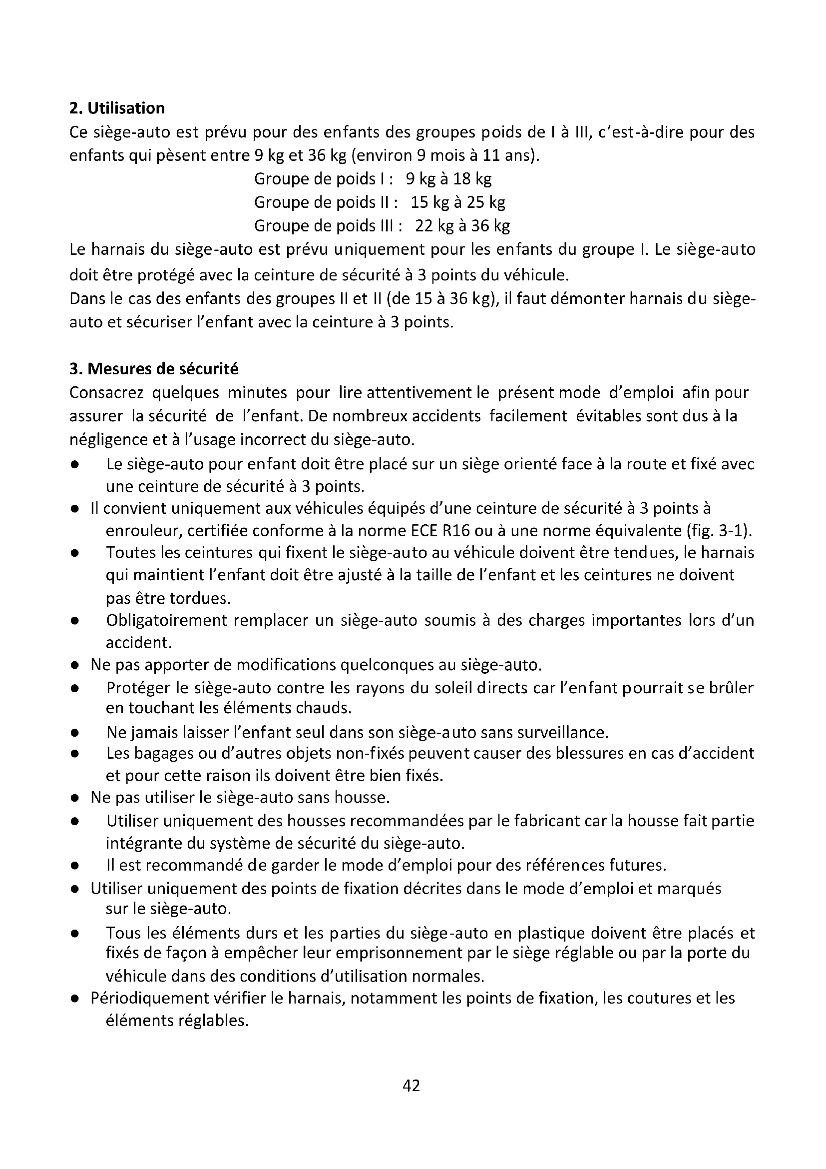 Consacrez quelques minutes pour lire attentivement le présent mode d’emploi afin pour assurer la sécurité de l’enfant. De nombreux accidents facilement évitables sont dus à la négligence et à l’usage incorrect du siège-auto. ● Le siège-auto pour enfant doit être placé sur un siège orienté face à la route et fixé avec une ceinture de sécurité à 3 points. ● Il convient uniquement aux véhicules équipés d’une ceinture de sécurité à 3 points à enrouleur, certifiée conforme à la norme ECE R16 ou à une norme équivalente (fig. 3-1). ● Toutes les ceintures qui fixent le siège-auto au véhicule doivent être tendues, le harnais qui maintient l’enfant doit être ajusté à la taille de l’enfant et les ceintures ne doivent pas être tordues. ● Obligatoirement remplacer un siège-auto soumis à des charges importantes lors d’un accident. ● Ne pas apporter de modifications quelconques au siège-auto. ● Protéger le siège-auto contre les rayons du soleil directs car l’enfant pourrait se brûler en touchant les éléments chauds. ● Ne jamais laisser l’enfant seul dans son siège-auto sans surveillance. ● Les bagages ou d’autres objets non-fixés peuvent causer des blessures en cas d’accident et pour cette raison ils doivent être bien fixés. ● Ne pas utiliser le siège-auto sans housse. ● Utiliser uniquement des housses recommandées par le fabricant car la housse fait partie intégrante du système de sécurité du siège-auto. ● Il est recommandé de garder le mode d’emploi pour des références futures. ● Utiliser uniquement des points de fixation décrites dans le mode d’emploi et marqués sur le siège-auto. ● Tous les éléments durs et les parties du siège-auto en plastique doivent être placés et fixés de façon à empêcher leur emprisonnement par le siège réglable ou par la porte du véhicule dans des conditions d’utilisation normales. ● Périodiquement vérifier le harnais, notamment les points de fixation, les coutures et les éléments réglables.43 ● Ne plus utiliser un siège-auto dont les éléments ont été endommagés ou desserrées suite à un accident. ● En cas d’urgence, il est important de pouvoir déboucler rapidement la ceinture de sécurité. Cela veut dire que le bouton de déverrouillage du harnais n’est pas totalement sécurisé. Apprenez à l’enfant à ne pas jouer avec la boucle. ● S’assurer que tous les éléments sont bien attachés et qu’ils n’empêchent pas le réglage des sièges ou la fermeture des portes. ● Ne pas utiliser le siège-auto pour enfant à la maison. Il n’est pas adapté à cet usage et il doit être utilisé uniquement dans un véhicule. ● Nous recommandons d’installer le siège-auto uniquement sur la banquette arrière du véhicule. ● Avant chaque trajet s’assurer que le siège-auto est correctement installé. ● La partie arrière du dossier du siège-auto pour enfant doit adhérer à plat au dossier de la banquette arrière. Si nécessaire, régler l’appui-tête de la banquette arrière du véhicule. ● La boucle de la ceinture de sécurité à 3 points ne doit pas se trouver trop près de la partie inférieure de l’accoudoir du siège-auto. En cas de doutes, contacter le fabricant du siège- auto (fig. 3-2). ● Pendant les trajets sans enfant, le siège-auto vide doit toujours rester fixé avec la ceinture à 3 points.