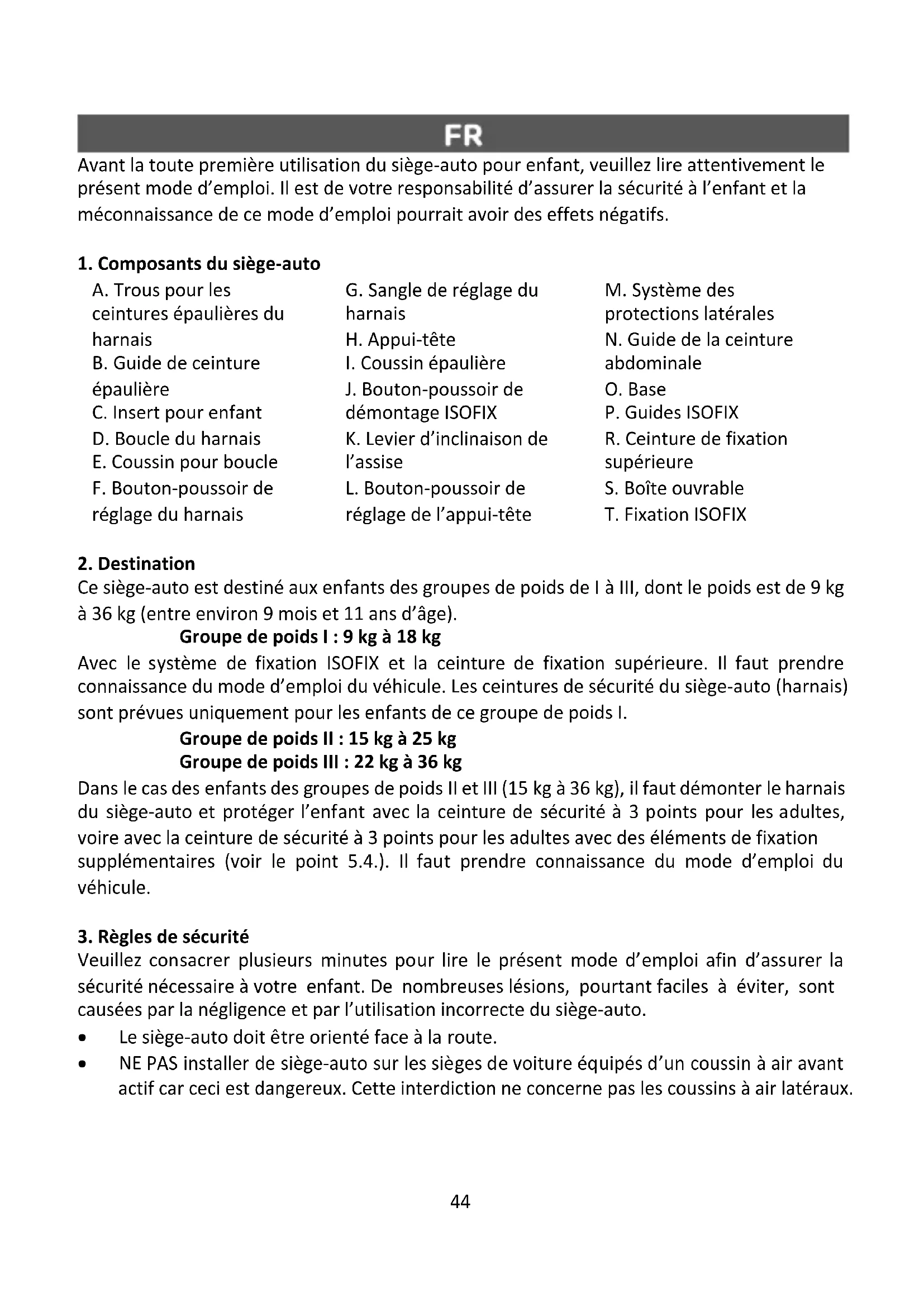 Veuillez consacrer plusieurs minutes pour lire le présent mode d’emploi afin d’assurer la sécurité nécessaire à votre enfant. De nombreuses lésions, pourtant faciles à éviter, sont causées par la négligence et par l’utilisation incorrecte du siège-auto.