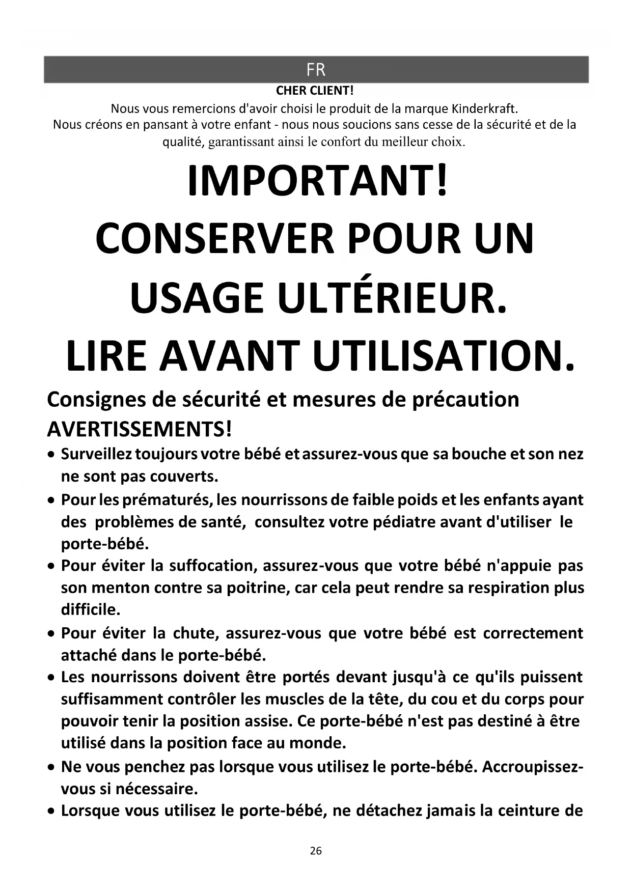 CHER CLIENT! Nous vous remercions d'avoir choisi le produit de la marque Kinderkraft. Nous créons en pansant à votre enfant - nous nous soucions sans cesse de la sécurité et de la qualité, garantissant ainsi le confort du meilleur choix. IMPORTANT!