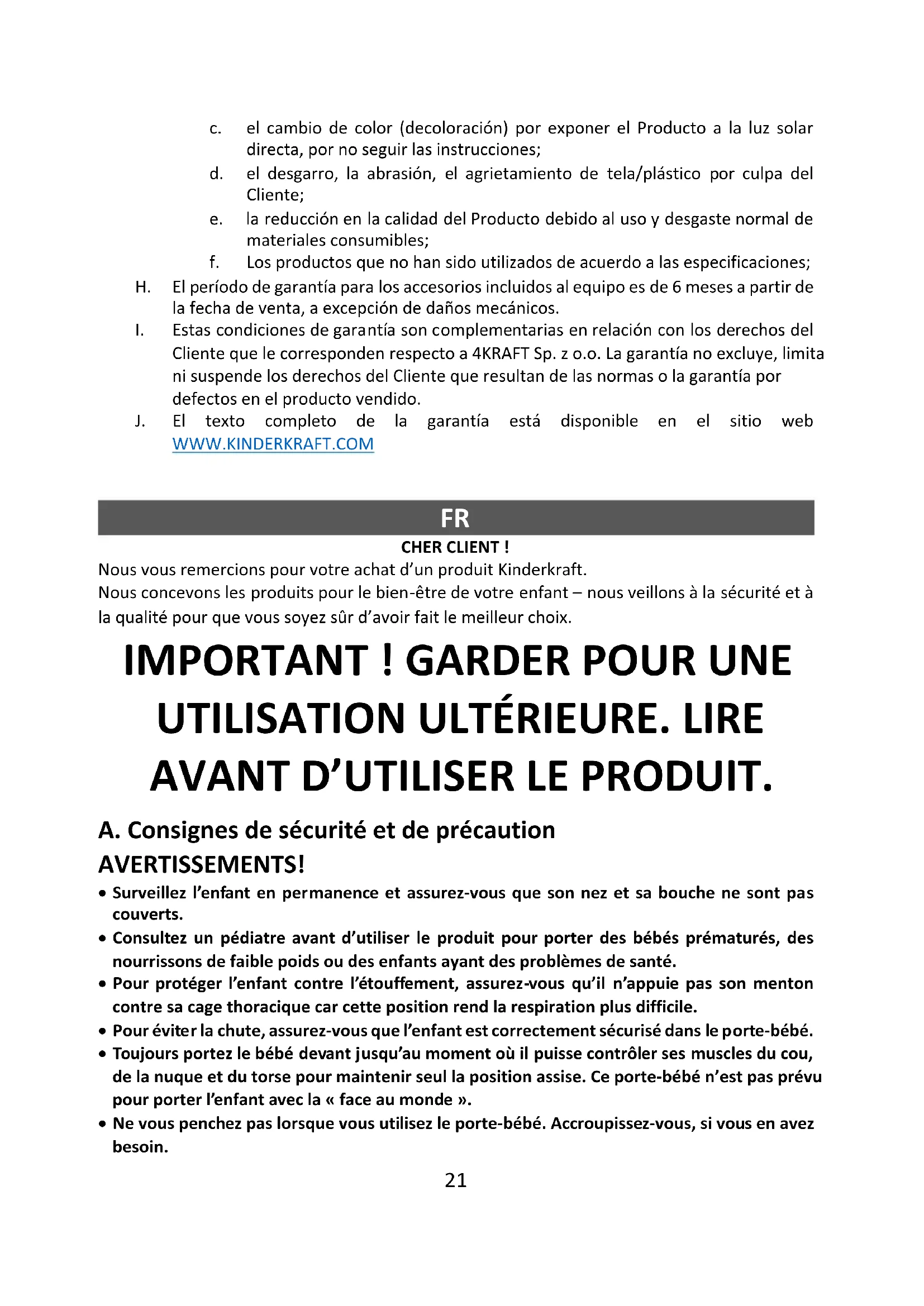 E. Stockage Si le porte-bébé n’est pas utilisé, il doit être conservé hors de portée des enfants. F. Garantie A. Tous les produits de Kinderkraft sont couverts par la garantie de 24 mois. La période de garantie commence à la date de la remise du produit à l'Acheteur. B. La garantie est valable pour les Produits vendus dans les pays comme suit: France, Espagne, Allemagne, Pologne, Royaume-Uni, Italie. C. Dans les pays qui ne figurent pas ci-dessus, les conditions de garantie sont déterminées par le Vendeur. D. Il est possible de proroger la durée de garantie jusqu'à 120 mois (10 ans). Le texte intégral avec les conditions et le formulaire d'inscription à la garantie prorogée sont disponibles sur le site WWW.KINDERKRAFT.COM E. La garantie est valable uniquement dans le pays où l'achat a été effectué. F. Les réclamations doivent être soumises en renseignant le formulaire disponible sur le site WWW.RMA.KINDERKRAFT.COM G. La garantie ne couvre pas: a. les réclamations concernant les paramètres techniques du Produit, tant qu'ils sont conformes à ce qui est précisé dans le mode d'emploi ou dans d'autres documents de nature législative; b. les dommages du Produit causés par un entretien non conforme ou une utilisation des produits chimiques non conformes; c. le changement de couleur (décoloration) suite à l'exposition intense du Produit au soleil en dépit des dispositions du mode d'emploi; d. les déchirures, abrasions, ruptures de tissu /plastique causées par le Client; e. la baisse de la qualité du Produit en raison de l'usure normale du produit et des consommables; f. les Produits qui n'ont pas été utilisés conformément aux spécifications; H. La période de garantie pour les accessoires joints à l'appareil est de 6 mois à compter de la date de vente, à l'exception des dommages mécaniques.