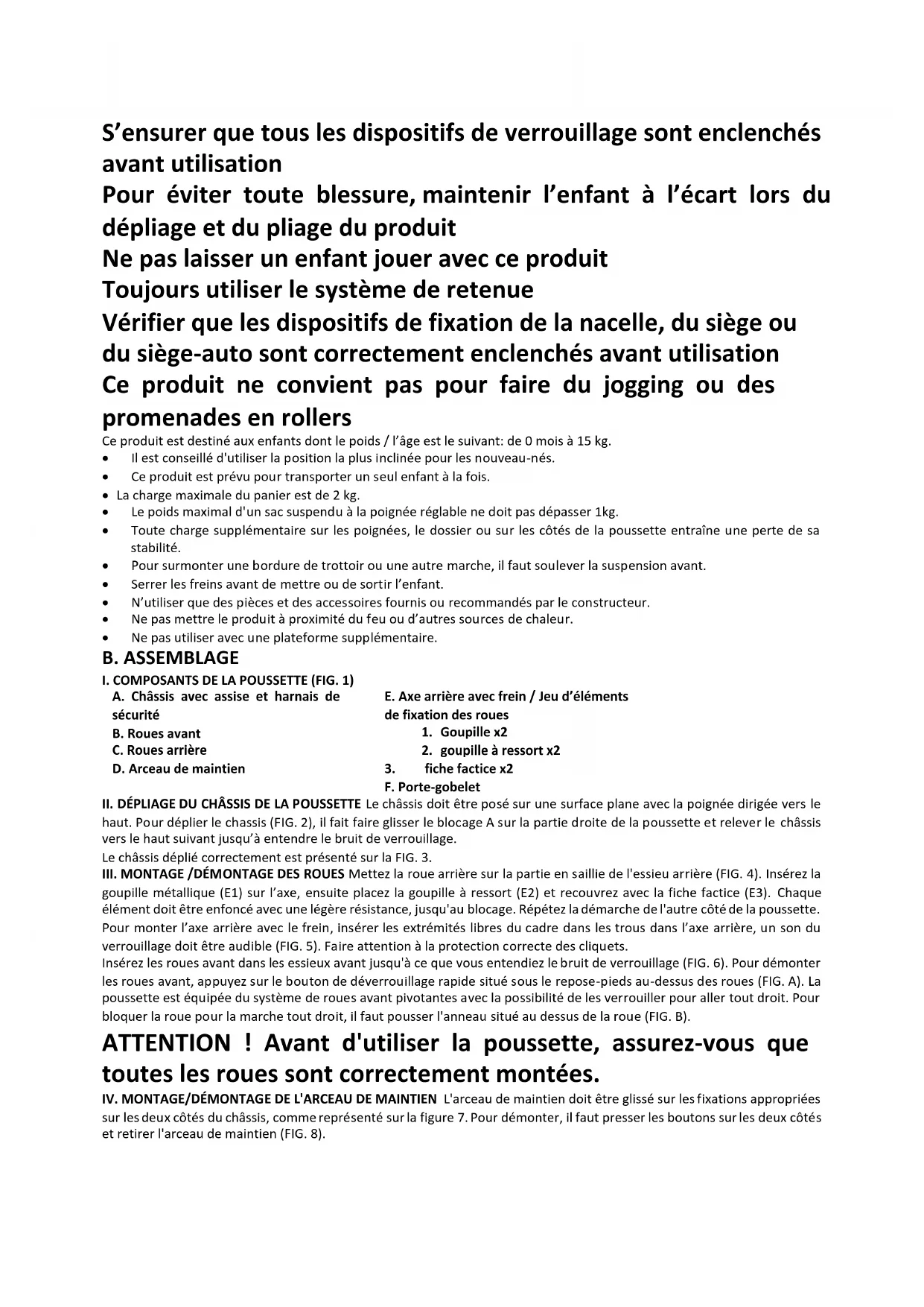 haut. Pour déplier le chassis (FIG. 2), il fait faire glisser le blocage A sur la partie droite de la poussette et relever le châssis vers le haut suivant jusqu’à entendre le bruit de verrouillage. Le châssis déplié correctement est présenté sur la FIG. 3. III. MONTAGE /DÉMONTAGE DES ROUES Mettez la roue arrière sur la partie en saillie de l'essieu arrière (FIG. 4). Insérez la goupille métallique (E1) sur l’axe, ensuite placez la goupille à ressort (E2) et recouvrez avec la fiche factice (E3). Chaque élément doit être enfoncé avec une légère résistance, jusqu'au blocage. Répétez la démarche de l'autre côté de la poussette. Pour monter l’axe arrière avec le frein, insérer les extrémités libres du cadre dans les trous dans l’axe arrière, un son du verrouillage doit être audible (FIG. 5). Faire attention à la protection correcte des cliquets. Insérez les roues avant dans les essieux avant jusqu'à ce que vous entendiez le bruit de verrouillage (FIG. 6). Pour démonter les roues avant, appuyez sur le bouton de déverrouillage rapide situé sous le repose-pieds au-dessus des roues (FIG. A). La poussette est équipée du système de roues avant pivotantes avec la possibilité de les verrouiller pour aller tout droit. Pour bloquer la roue pour la marche tout droit, il faut pousser l'anneau situé au dessus de la roue (FIG. B). ATTENTION ! Avant d'utiliser la poussette, assurez-vous que toutes les roues sont correctement montées.