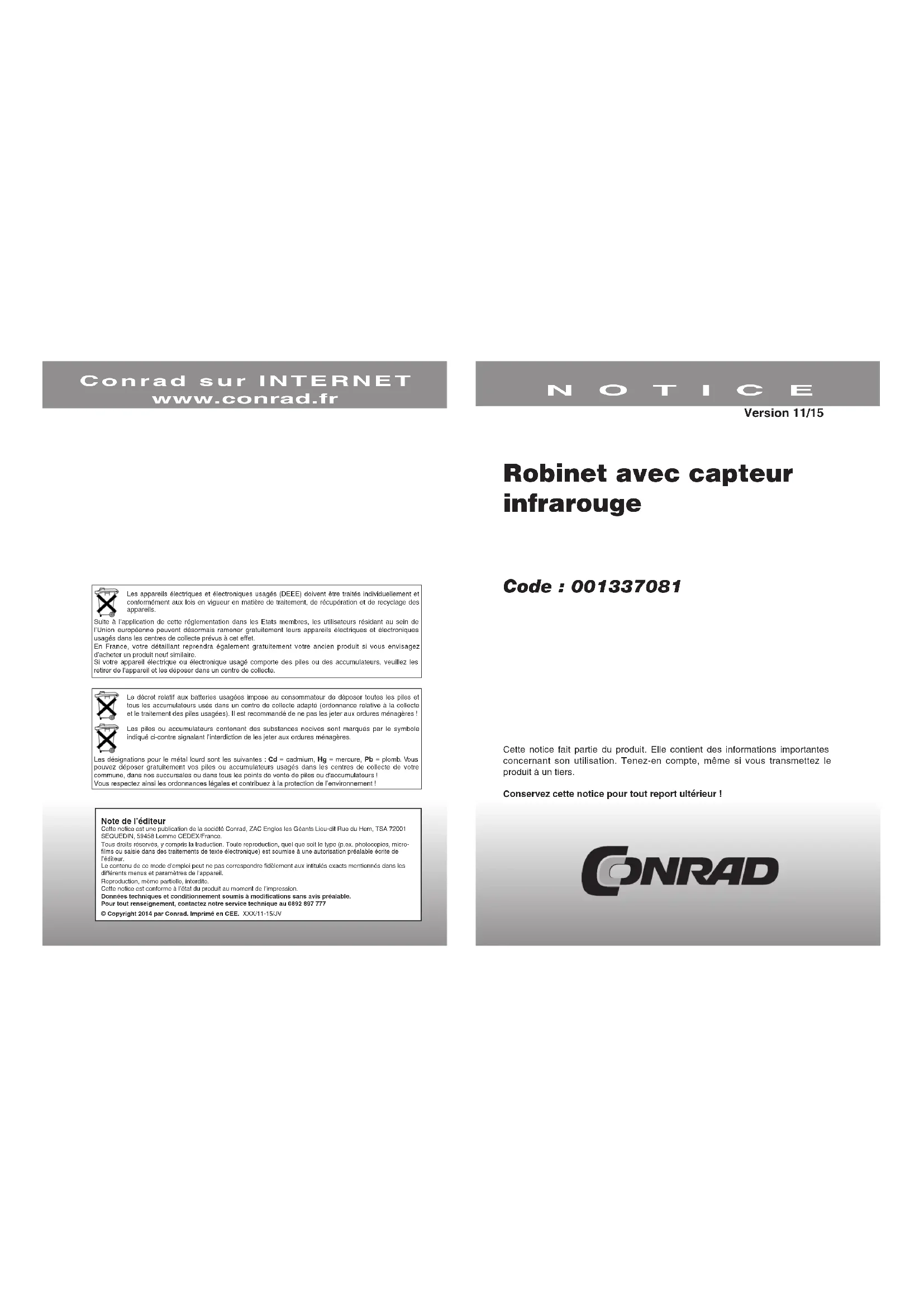 Robinet avec capteur infrarouge Code : 001337081 Cette notice fait partie du produit. Elle contient des informations importantes concernant son utilisation. Tenez-en compte, même si vous transmettez le produit à un tiers. Conservez cette notice pour tout report ultérieur ! NOTICE Conrad sur INTERNET www.conrad.fr Version 11/15 Les appareils électriques et électroniques usagés (DEEE) doivent être traités individuellement et conformément aux lois en vigueur en matière de traitement, de récupération et de recyclage des appareils.Suite à l’application de cette réglementation dans les Etats membres, les utilisateurs résidant au sein de l’Union européenne peuvent désormais ramener gratuitement leurs appareils électriques et électroniques usagés dans les centres de collecte prévus à cet effet.En France, votre détaillant reprendra également gratuitement votre ancien produit si vous envisagez d’acheter un produit neuf similaire.Si votre appareil électrique ou électronique usagé comporte des piles ou des accumulateurs, veuillez les retirer de l’appareil et les déposer dans un centre de collecte.Le décret relatif aux batteries usagées impose au consommateur de déposer toutes les piles et tous les accumulateurs usés dans un centre de collecte adapté (ordonnance relative à la collecte et le traitement des piles usagées). Il est recommandé de ne pas les jeter aux ordures ménagères !Les piles ou accumulateurs contenant des substances nocives sont marqués par le symbole indiqué ci-contre signalant l’interdiction de les jeter aux ordures ménagères. Les désignations pour le métal lourd sont les suivantes : Cd = cadmium, Hg = mercure, Pb = plomb. Vous pouvez déposer gratuitement vos piles ou accumulateurs usagés dans les centres de collecte de votre commune, dans nos succursales ou dans tous les points de vente de piles ou d'accumulateurs !Vous respectez ainsi les ordonnances légales et contribuez à la protection de l’environnement !Note de l’éditeurCette notice est une publication de la société Conrad, ZAC Englos les Géants Lieu-dit Rue du Hem, TSA 72001 SEQUEDIN, 59458 Lomme CEDEX/France.Tous droits réservés, y compris la traduction. Toute reproduction, quel que soit le type (p.ex. photocopies, micro-films ou saisie dans des traitements de texte électronique) est soumise à une autorisation préalable écrite de l’éditeur.Le contenu de ce mode d'emploi peut ne pas correspondre fidèlement aux intitulés exacts mentionnés dans les différents menus et paramètres de l'appareil.Reproduction, même partielle, interdite.Cette notice est conforme à l’état du produit au moment de l’impression.Données techniques et conditionnement soumis à modifications sans avis préalable.Pour tout renseignement, contactez notre service technique au 0892 897 777 © Copyright 2014 par Conrad. Imprimé en CEE. XXX/11-15/JV2 7 Consignes générales