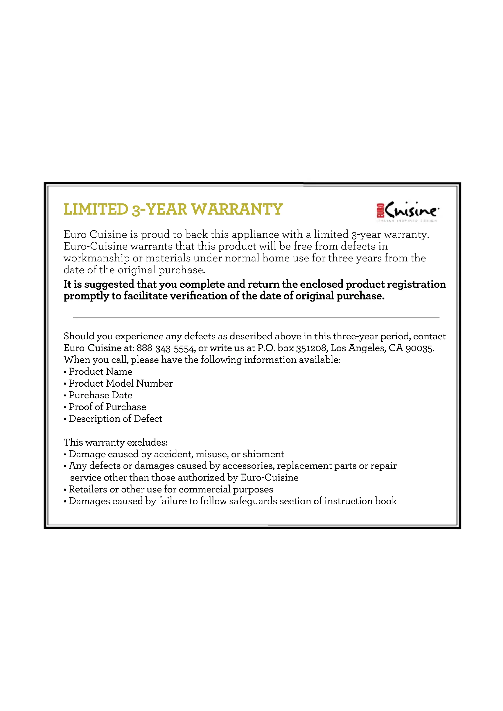 - Toutes défectuosités causés par des accessoires, piéces de remplacement ou ser vice de réparation autres que ceux autorisés par Euro Cuisine.