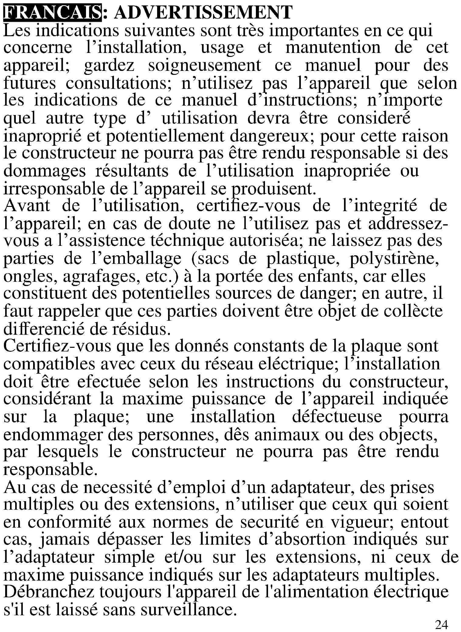 - Krümelschublade24 FRANCAIS: ADVERTISSEMENT Les indications suivantes sont très importantes en ce qui concerne l’installation, usage et manutention de cet appareil; gardez soigneusement ce manuel pour des futures consultations; n’utilisez pas l’appareil que selon les indications de ce manuel d’instructions; n’importe quel autre type d’ utilisation devra être consideré inaproprié et potentiellement dangereux; pour cette raison le constructeur ne pourra pas être rendu responsable si des dommages résultants de l’utilisation inapropriée ou irresponsable de l’appareil se produisent. Avant de l’utilisation, certifiez-vous de l’integrité de l’appareil; en cas de doute ne l’utilisez pas et addressez- vous a l’assistence téchnique autoriséa; ne laissez pas des parties de l’emballage (sacs de plastique, polystirène, ongles, agrafages, etc.) à la portée des enfants, car elles constituent des potentielles sources de danger; en autre, il faut rappeler que ces parties doivent être objet de collècte differencié de résidus. Certifiez-vous que les donnés constants de la plaque sont compatibles avec ceux du réseau eléctrique; l’installation doit être efectuée selon les instructions du constructeur, considérant la maxime puissance de l’appareil indiquée sur la plaque; une installation défectueuse pourra endommager des personnes, dês animaux ou des objects, par lesquels le constructeur ne pourra pas être rendu responsable. Au cas de necessité d’emploi d’un adaptateur, des prises multiples ou des extensions, n’utiliser que ceux qui soient en conformité aux normes de securité en vigueur; entout cas, jamais dépasser les limites d’absortion indiqués sur l’adaptateur simple et/ou sur les extensions, ni ceux de maxime puissance indiqués sur les adaptateurs multiples. Débranchez toujours l'appareil de l'alimentation électrique s'il est laissé sans surveillance.25 Ne pas laisser l’appareil inutilemente connecté a la prise eléctrique; c’est toujours mieux de le déconnecter quand il n’est pas à l’use. Pour le nettoyage déconnectez la fiche du secteur électrique. Quand l’appareil soit hors usage et ait été décidé qu’il ne sera pas reparé, on reccomande son inutilisation, en coupant son câble d’alimentation. - Ne pas approcher le câble d’alimentation d’objects coupants ou de surfaces chaudes, et ne pas tirer sur le cordon d’alimentation pour le débrancher de la prise. Ne le laissez pas pendre du plan de travail où un enfant pourrait le tenir. - Ne pas utiliser l’appareil si le câble d’alimentation ou la fiche de connéction eléctrique sont endommagés, ou encore en cas de court-circuits; dans ce cas là, apporter l’appareil a un centre d’assistence autorisé. - L’appareil n’est pas indiqué pour être exposé à des conditions météorologiques défavorables (pluie, vent, humidité, la glace, etc.); Gardez-le dans un endroit sec. Jamais opérer ou même toucher l’appareil avec les mains mouillées ou les pieds nus. - Cet appareil peut être utilisé par des enfants agés de plus de 8 ans et par des personnes avec une réduite capacité phisique, sensorial ou mental, ou encore avec peu d’expérience à son usage, pourvu qu’une supervision adéquate leur en soit assuré, ou s’ils auraient été instruits à l’usage de l’appareil en complete securité. Les opérations de nettoyage e de manutention ne oivent pás être efectués par des enfants, sauf pour ceux qui sont agés de plus de 8 ans et sont supervisionés. - Les enfants ne doivent pas jouer avec cet appareil. - Gardez l’appareil et le câble d’alimentation hors la portée des enfants agés de moins de 8 ans. - N’utiliser que des accéssoires e pièces d’origine.26 Si le câble d'alimentation est endommagé ou en cas de panne et / ou de dysfonctionnement, ne modifiez pas l'appareil. Toute réparation doit être effectuée par le fabricant ou par son service d'assistance technique ou, en tout cas, par une personne possédant une qualification similaire, afin d'éviter tout risque. Le non-respect de ce qui précède peut compromettre la sécurité de l'appareil et invalider les conditions de la garantie. ATTENTION: Cet appareil comporte une fonction de chauffage. Ne pas couvrir. Gardez de l'espace sur les côtés lors de l'utilisation. Quelques surfaces, même si non la plaque elle même, pourront atteindre des températures élevées. Étant donné que la sensibilité à la température diffère de personne à personne, cet appareil devrà être usé avec PRUDENCE. Placez l’appareil sur des surfaces adéhrentes et préparées pour cet effet, et utilisez les mésures de protection contre la chaleur conseillées. - Cet appareil est destiné à être utilisé dans les ménages et des applications similaires: les cuisines du personnel dans les magasins, bureaux et autres environnements de travail, pour les clients dans les hôtels, motels et autres environnements de type résidentiel, de type lit et petit- déjeuner, hébergement. - L’appareil n’est pas conçu pour être utilisé avec une minuterie extérieure ou un commande à distance. - Avant chaque utilisation, effectuez le cordon d'alimentation. Ne soumettez pas le produit à des chocs susceptibles de l'endommager. - Tenir l’appareil à l’écart des environnements où il peut y avoir des gaz, vapeurs, des substances inflammables ou explosives.