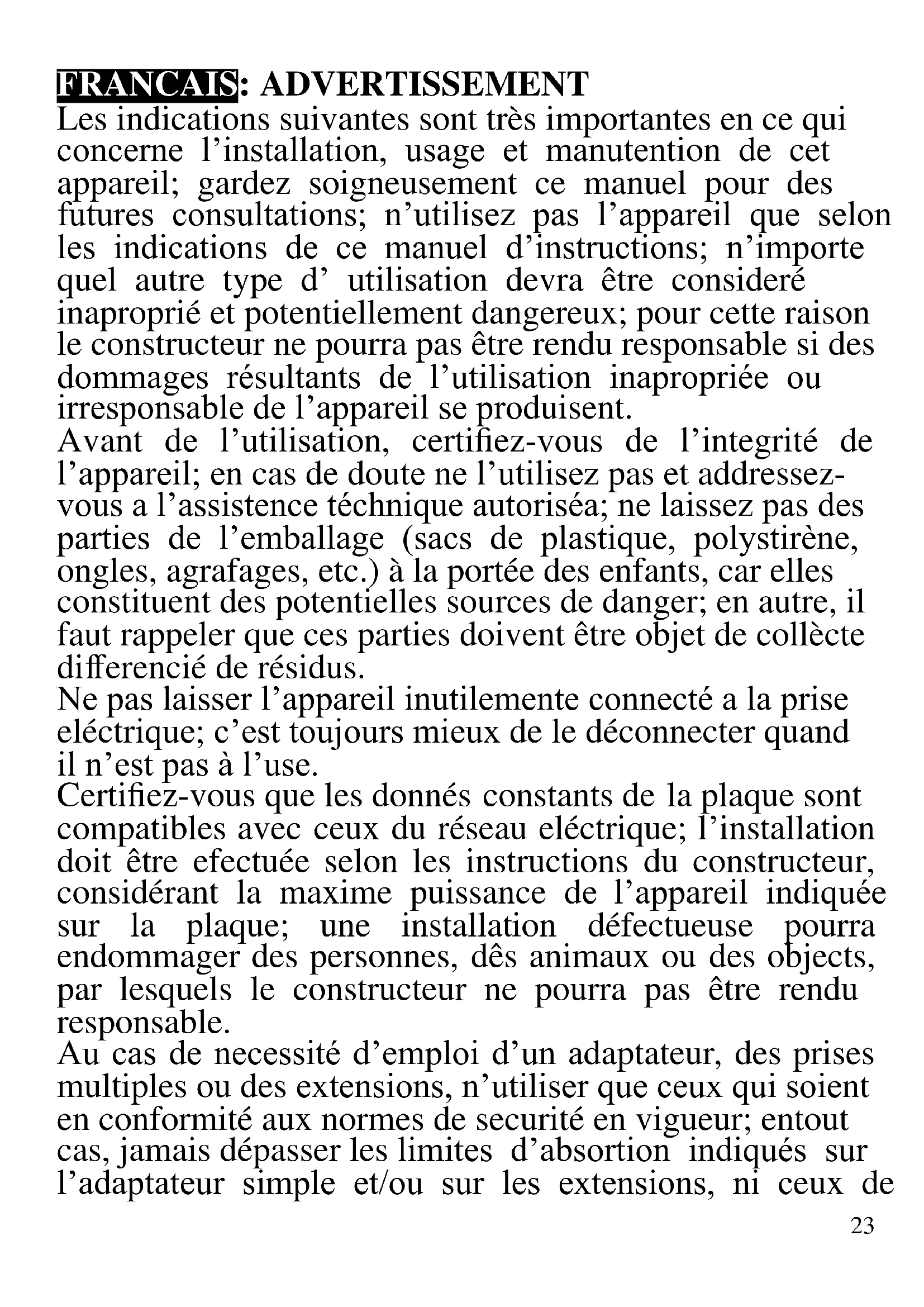 - Timer, Krümelschublade23 FRANCAIS: ADVERTISSEMENT Les indications suivantes sont très importantes en ce qui concerne l’installation, usage et manutention de cet appareil; gardez soigneusement ce manuel pour des futures consultations; n’utilisez pas l’appareil que selon les indications de ce manuel d’instructions; n’importe quel autre type d’ utilisation devra être consideré inaproprié et potentiellement dangereux; pour cette raison le constructeur ne pourra pas être rendu responsable si des dommages résultants de l’utilisation inapropriée ou irresponsable de l’appareil se produisent. Avant de l’utilisation, certifiez-vous de l’integrité de l’appareil; en cas de doute ne l’utilisez pas et addressez- vous a l’assistence téchnique autoriséa; ne laissez pas des parties de l’emballage (sacs de plastique, polystirène, ongles, agrafages, etc.) à la portée des enfants, car elles constituent des potentielles sources de danger; en autre, il faut rappeler que ces parties doivent être objet de collècte differencié de résidus. Ne pas laisser l’appareil inutilemente connecté a la prise eléctrique; c’est toujours mieux de le déconnecter quand il n’est pas à l’use. Certifiez-vous que les donnés constants de la plaque sont compatibles avec ceux du réseau eléctrique; l’installation doit être efectuée selon les instructions du constructeur, considérant la maxime puissance de l’appareil indiquée sur la plaque; une installation défectueuse pourra endommager des personnes, dês animaux ou des objects, par lesquels le constructeur ne pourra pas être rendu responsable. Au cas de necessité d’emploi d’un adaptateur, des prises multiples ou des extensions, n’utiliser que ceux qui soient en conformité aux normes de securité en vigueur; entout cas, jamais dépasser les limites d’absortion indiqués sur l’adaptateur simple et/ou sur les extensions, ni ceux de24 maxime puissance indiqués sur les adaptateurs multiples. Quand l’appareil soit hors usage et ait été décidé qu’il ne sera pas reparé, on reccomande son inutilisation, en coupant son câble d’alimentation. Débranchez toujours l'appareil de l'alimentation électrique s'il est laissé sans surveillance et avant de l'assembler et de le désassembler. Pour le nettoyage déconnectez la fiche du secteur électrique. - Ne pas approcher le câble d’alimentation d’objects coupants ou de surfaces chaudes, et ne pas tirer sur le cordon d’alimentation pour le débrancher de la prise. Ne le laissez pas pendre du plan de travail où un enfant pourrait le tenir. - Ne pas utiliser l’appareil si le câble d’alimentation ou la fiche de connéction eléctrique sont endommagés, ou encore en cas de court-circuits; dans ce cas là, apporter l’appareil a un centre d’assistence autorisé. - L’appareil n’est pas indiqué pour être exposé à des conditions météorologiques défavorables (pluie, vent, humidité, la glace, etc.); Gardez-le dans un endroit sec. Jamais opérer ou même toucher l’appareil avec les mains mouillées ou les pieds nus. - Cet appareil peut être utilisé par des enfants agés de plus de 8 ans et par des personnes avec une réduite capacité phisique, sensorial ou mental, ou encore avec peu d’expérience à son usage, pourvu qu’une supervision adéquate leur en soit assuré, ou s’ils auraient été instruits à l’usage de l’appareil en complete securité. Les opérations de nettoyage e de manutention ne oivent pás être efectués par des enfants, sauf pour ceux qui sont agés de plus de 8 ans et sont supervisionés. - Gardez l’appareil et le câble d’alimentation hors la portée des enfants agés de moins de 8 ans. - Les enfants ne doivent pas jouer avec cet appareil. - L’appareil est pour l’usage domestique et intérieur.25 ATTENTION: Cet appareil comporte une fonction de chauffage. Quelques surfaces, même si non la plaque elle même, pourront atteindre des températures élevées. Étant donné que la sensibilité à la température diffère de personne à personne, cet appareil devrà être usé avec PRUDENCE. Placez l’appareil sur des surfaces adéhrentes et préparées pour cet effet, et utilisez les mésures de protection contre la chaleur conseillées, comme dês poignées ou des gants de cuisine. Au cas de panne et/ou de mauvais fonctionnement, ne pas intervenir sur l’ appareil. Pour une éventuel réparation s’addresser uniquement a un centre autorisé par le constructeur, en demandant dês pièces de remplacement originaux. Le non respect de ces indications peut compromettre la securité de l’appareil e rendre invalides les termes de la garantie. - Cet appareil est destiné à être utilisé dans les ménages et des applications similaires: les cuisines du personnel dans les magasins, bureaux et autres environnements de travail, pour les clients dans les hôtels, motels et autres environnements de type résidentiel, de type lit et petit- déjeuner, hébergement. - L’appareil n’est pas conçu pour être utilisé avec une minuterie extérieure ou un commande à distance. Avant chaque utilisation, effectuez le cordon d'alimentation. Ne soumettez pas le produit à des chocs susceptibles de l'endommager. Tenir l’appareil à l’écart des environnements où il peut y avoir des gaz, vapeurs, des substances inflammables ou explosives. N’utiliser que des accéssoires e pièces d’origine.