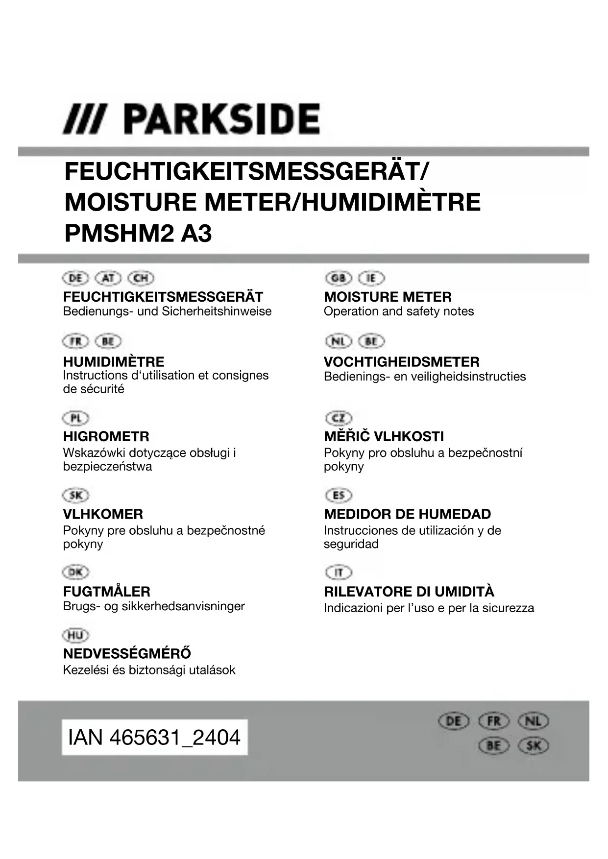 PDF ONLINE parkside-diy.com You can download and view this and numer- ous other manuals at parkside- diy.com. This QR code takes you directly to parkside-diy. com. Choose your country and use the search screen to search for the operating instructions. Entering the item number (IAN) 465631_240478 GB/IE takes you to the operating instructions for your item. Service Service Great Britain Tel.: 0800 0569216 E-Mail: owim@lidl.co.uk Service Ireland Tel.: 1800 200736 E-Mail: owim@lidl.ie79 FR/BE Légende des pictogrammes utilisés .......... Page 81 Introduction ................................ Page 84 Utilisation conforme ...................... Page 84 Descriptif des pièces .................... Page 85 Caractéristiques techniques ......... Page 86 Contenu de la livraison .................. Page 87 Instructions générales de sécurité ......................................... Page 87 Consignes de sécurité relatives aux piles / aux piles rechargeables ... Page 90 Avant la mise en service ..... Page 95 Insérer / remplacer les piles ................................................ Page 96 Mise en marche ....................... Page 97 Avant l‘opération de mesure ......... Page 9780 FR/BE Eectuer une mesure .................... Page 98 Achage de l‘usure de la pile ....... Page 103 Achage de la température .......... Page 103 Rotation de l’achage sur écran .. Page 104 Fonction RESET ............................ Page 104 Dépannage ................................. Page 105 Nettoyage et entretien ......... Page 107 Rangement ................................. Page 108 Mise au rebut ............................ Page 108 Garantie ........................................ Page 112 Faire valoir sa garantie .................. Page 118 Service après-vente ...................... Page 12181 FR/BE Légende des pictogrammes utilisés Courant continu/Tension continue Pile fournie Le sigle CE conrme la conformité avec les directives UE applicables au produit. Consignes de sécurité Instructions de manipulation À conserver hors de portée des enfants Ne pas jeter au feu82 FR/BE Légende des pictogrammes utilisés Veiller à une insertion correcte Ne pas déformer/détériorer Ne pas ouvrir/démonter Ne pas mélanger des types et des marques diérents Ne pas mélanger des piles usagées et des piles neuves Ne pas recharger83 FR/BE Légende des pictogrammes utilisés Tenir les piles éloignées de l'eau et d'une humidité excessive. Ne pas court-circuiter Insérer correctement Uniquement conçu pour un usage en intérieur84 FR/BE Humidimètre Introduction Nous vous félicitons pour l‘achat de votre nouveau produit. Vous avez opté pour un pro- duit de grande qualité. Le mode d‘emploi fait partie intégrante de ce produit. Il contient des indications importantes pour la sécurité, l’utili- sation et la mise au rebut. Veuillez lire conscien- cieusement toutes les indications d‘utilisation et de sécurité du produit. Ce produit doit uni- quement être utilisé conformément aux ins- tructions et dans les domaines d‘application spéciés. Lors d‘une cession à tiers, veuillez également remettre tous les documents.