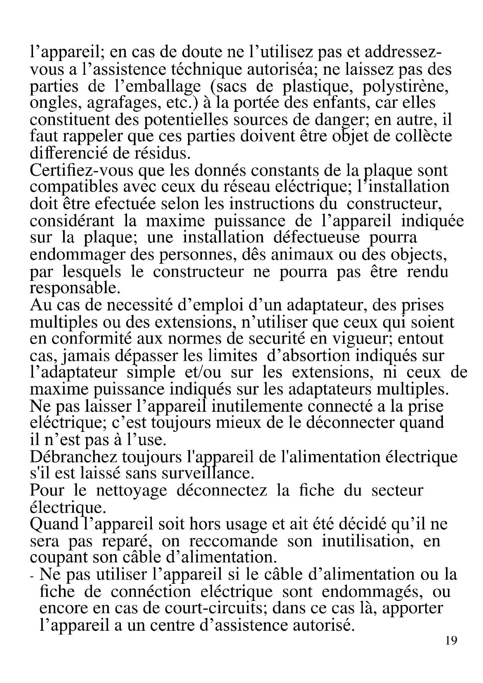 FRANCAIS: ADVERTISSEMENT Les indications suivantes sont très importantes en ce qui concerne l’installation, usage et manutention de cet appareil; gardez soigneusement ce manuel pour des futures consultations; n’utilisez pas l’appareil que selon les indications de ce manuel d’instructions; n’importe quel autre type d’ utilisation devra être consideré inaproprié et potentiellement dangereux; pour cette raison le constructeur ne pourra pas être rendu responsable si des dommages résultants de l’utilisation inapropriée ou irresponsable de l’appareil se produisent. Avant de l’utilisation, certifiez-vous de l’integrité de19 l’appareil; en cas de doute ne l’utilisez pas et addressez- vous a l’assistence téchnique autoriséa; ne laissez pas des parties de l’emballage (sacs de plastique, polystirène, ongles, agrafages, etc.) à la portée des enfants, car elles constituent des potentielles sources de danger; en autre, il faut rappeler que ces parties doivent être objet de collècte differencié de résidus. Certifiez-vous que les donnés constants de la plaque sont compatibles avec ceux du réseau eléctrique; l’installation doit être efectuée selon les instructions du constructeur, considérant la maxime puissance de l’appareil indiquée sur la plaque; une installation défectueuse pourra endommager des personnes, dês animaux ou des objects, par lesquels le constructeur ne pourra pas être rendu responsable. Au cas de necessité d’emploi d’un adaptateur, des prises multiples ou des extensions, n’utiliser que ceux qui soient en conformité aux normes de securité en vigueur; entout cas, jamais dépasser les limites d’absortion indiqués sur l’adaptateur simple et/ou sur les extensions, ni ceux de maxime puissance indiqués sur les adaptateurs multiples. Ne pas laisser l’appareil inutilemente connecté a la prise eléctrique; c’est toujours mieux de le déconnecter quand il n’est pas à l’use. Débranchez toujours l'appareil de l'alimentation électrique s'il est laissé sans surveillance. Pour le nettoyage déconnectez la fiche du secteur électrique. Quand l’appareil soit hors usage et ait été décidé qu’il ne sera pas reparé, on reccomande son inutilisation, en coupant son câble d’alimentation. - Ne pas utiliser l’appareil si le câble d’alimentation ou la fiche de connéction eléctrique sont endommagés, ou encore en cas de court-circuits; dans ce cas là, apporter l’appareil a un centre d’assistence autorisé.20 - Ne pas approcher le câble d’alimentation d’objects coupants ou de surfaces chaudes, et ne pas tirer sur le cordon d’alimentation pour le débrancher de la prise. Ne le laissez pas pendre du plan de travail où un enfant pourrait le tenir. - L’appareil n’est pas indiqué pour être exposé à des conditions météorologiques défavorables (pluie, vent, humidité, la glace, etc.); Gardez-le dans un endroit sec. Jamais opérer ou même toucher l’appareil avec les mains mouillées ou les pieds nus. - Cet appareil peut être utilisé par des enfants agés de plus de 8 ans et par des personnes avec une réduite capacité phisique, sensorial ou mental, ou encore avec peu d’expérience à son usage, pourvu qu’une supervision adéquate leur en soit assuré, ou s’ils auraient été instruits à l’usage de l’appareil en complete securité. Les opérations de nettoyage e de manutention ne oivent pás être efectués par des enfants, sauf pour ceux qui sont agés de plus de 8 ans et sont supervisionés. - Les enfants ne doivent pas jouer avec cet appareil. - Gardez l’appareil et le câble d’alimentation hors la portée des enfants agés de moins de 8 ans. Si le câble d'alimentation est endommagé ou en cas de panne et / ou de dysfonctionnement, ne modifiez pas l'appareil. Toute réparation doit être effectuée par le fabricant ou par son service d'assistance technique ou, en tout cas, par une personne possédant une qualification similaire, afin d'éviter tout risque. Le non-respect de ce qui précède peut compromettre la sécurité de l'appareil et invalider les conditions de la garantie. ATTENTION: Cet appareil comporte une fonction de chauffage. Quelques surfaces, même si non la plaque elle même, pourront atteindre des températures élevées. Étant donné que la sensibilité à la température diffère de personne à personne, cet appareil devrà être usé avec21 PRUDENCE. Placez l’appareil sur des surfaces adéhrentes et préparées pour cet effet, et utilisez les mésures de protection contre la chaleur conseillées. - Cet appareil est destiné à être utilisé dans les ménages et des applications similaires: les cuisines du personnel dans les magasins, bureaux et autres environnements de travail, pour les clients dans les hôtels, motels et autres environnements de type résidentiel, de type lit et petit- déjeuner, hébergement. - L’appareil n’est pas conçu pour être utilisé avec une minuterie extérieure ou un commande à distance. - N’utiliser que des accéssoires e pièces d’origine. - Avant chaque utilisation, effectuez le cordon d'alimentation. Ne soumettez pas le produit à des chocs susceptibles de l'endommager. - Tenir l’appareil à l’écart des environnements où il peut y avoir des gaz, vapeurs, des substances inflammables ou explosives.