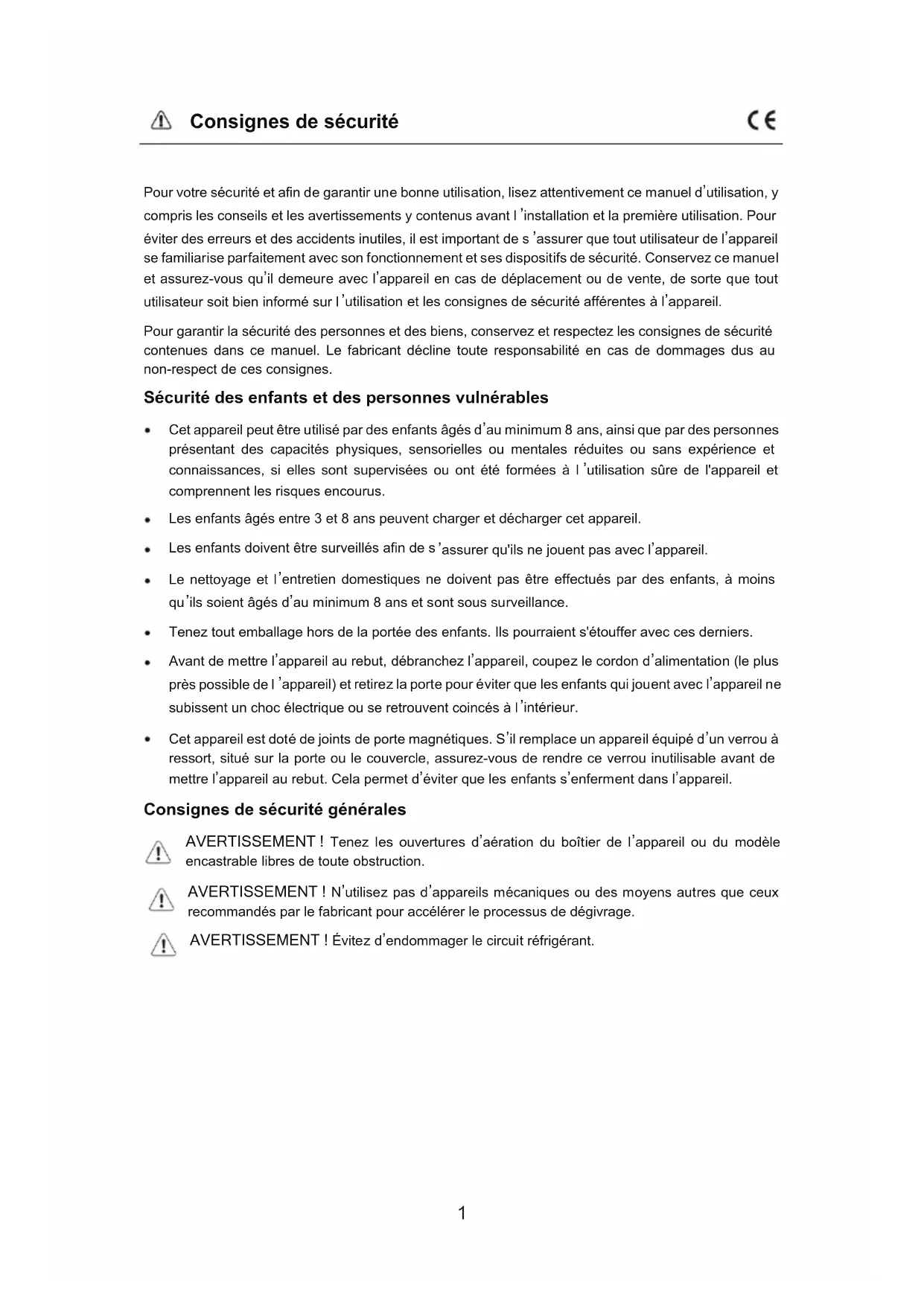 ’ils soient âgés d’au minimum 8 ans et sont sous surveillance. Tenez tout emballage hors de la portée des enfants. Ils pourraient s'étouffer avec ces derniers. Avant de mettre l’appareil au rebut, débranchez l’appareil, coupez le cordon d’alimentation (le plus près possible de l ’appareil) et retirez la porte pour éviter que les enfants qui jouent avec l’appareil ne subissent un choc électrique ou se retrouvent coincés à l ’intérieur. Cet appareil est doté de joints de porte magnétiques. S’il remplace un appareil équipé d’un verrou à ressort, situé sur la porte ou le couvercle, assurez-vous de rendre ce verrou inutilisable avant de mettre l ’appareil au rebut. Cela permet d’éviter que les enfants s’enferment dans l’appareil. Consignes de sécurité générales AVERTISSEMENT ! Tenez les ouvertures d’aération du boîtier de l’appareil ou du modèle encastrable libres de toute obstruction. AVERTISSEMENT ! N’utilisez pas d’appareils mécaniques ou des moyens autres que ceux recommandés par le fabricant pour accélérer le processus de dégivrage. AVERTISSEMENT ! Évitez d’endommager le circuit réfrigérant. 1Consignes de sécurité