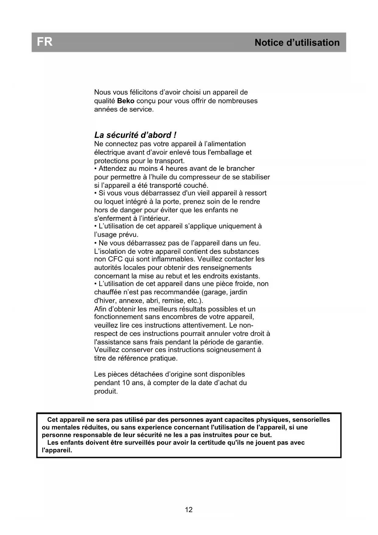 FR Notice d’utilisation Cet appareil ne sera pas utilisé par des personnes ayant capacites physiques, sensorielles ou mentales réduites, ou sans experience concernant l'utilisation de l'appareil, si une personne responsable de leur sécurité ne les a pas instruites pour ce but. Les enfants doivent être surveillés pour avoir la certitude qu'ils ne jouent pas avec l'appareil. 12FR Notice d’utilisation Conditions électriques Avant de brancher l'appareil à la prise murale, vérifiez que la tension et la fréquence indiquées sur la plaque signalétique à l'intérieur de l'appareil correspondent à votre alimentation électrique. Nous recommandons de connecter cet appareil au réseau électrique par le biais d’une prise dotée d’un commutateur et d'un fusible et placée de façon à être facile d’accès. Avertissement ! Cet appareil doit être branché à une borne de mise à la terre. Les réparations de l’appareillage électrique sont réservées exclusivement à un technicien qualifié. De mauvaises réparations réalisées par une personne non qualifiée peuvent occasionner des risques dont les conséquences peuvent être critiques pour l’utilisateur de l’appareil. ATTENTION ! Cet appareil fonctionne avec du R600a, un gaz qui contribue à la protection de l’environnement mais qui est inflammable. Pendant le transport et l’installation du produit, veillez à ne pas endommager le système réfrigérant. Si le système réfrigérant est abîmé et qu’une fuite de gaz se produit, tenez l’appareil à l’écart des sources de flammes vives et aérer bien la pièce. AVERTISSEMENT - N’utilisez pas d'outils mécaniques ou autres moyens pour accélérer le processus de décongélation autres que ceux qui sont recommandés par le fabricant. AVERTISSEMENT - N’abîmez pas le circuit réfrigérant. AVERTISSEMENT - Ne faites pas fonctionner d'appareils électriques à l'intérieur des compartiments de conservation de denrées, à moins qu’ils soient conformes au type d'appareils recommandés par le fabricant. AVERTISSEMENT - Si le cordon d’alimentation est endommagé, celui-ci doit être remplacé par le fabricant, ses agents agréés ou tout autre agent qualifié afin d'être à l'abri de tout danger.
