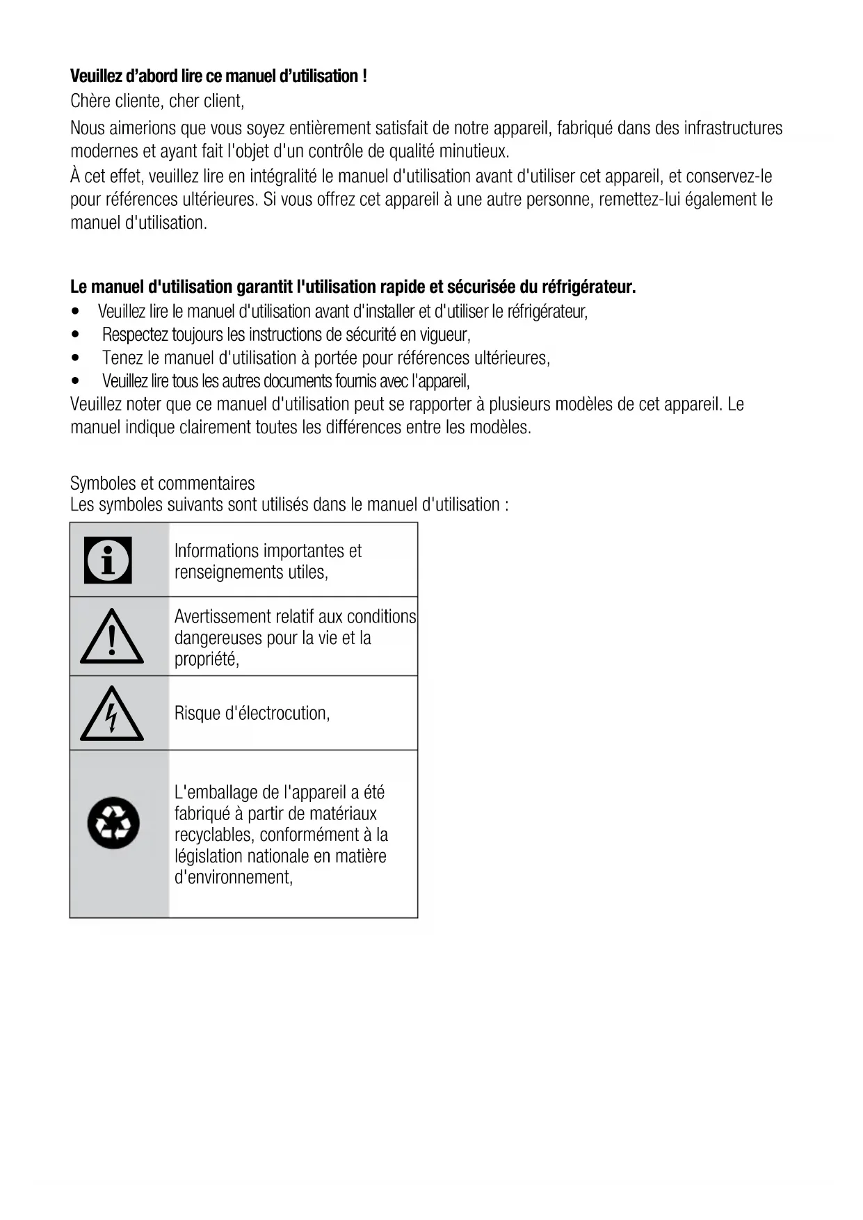 If the problem persists after following the instructions in this section, contact your vendor or an Authorised Service. Do not try to repair the product.Veuillez d’abord lire ce manuel d’utilisation ! Chère cliente, cher client, Nous aimerions que vous soyez entièrement satisfait de notre appareil, fabriqué dans des infrastructures modernes et ayant fait l'objet d'un contrôle de qualité minutieux. À cet effet, veuillez lire en intégralité le manuel d'utilisation avant d'utiliser cet appareil, et conservez-le pour références ultérieures. Si vous offrez cet appareil à une autre personne, remettez-lui également le manuel d'utilisation. Le manuel d'utilisation garantit l'utilisation rapide et sécurisée du réfrigérateur. t Veuillez lire le manuel d'utilisation avant d'installer et d'utiliser le réfrigérateur, t Respectez toujours les instructions de sécurité en vigueur, t Tenez le manuel d'utilisation à portée pour références ultérieures, t Veuillez lire tous les autres documents fournis avec l'appareil, Veuillez noter que ce manuel d'utilisation peut se rapporter à plusieurs modèles de cet appareil. Le manuel indique clairement toutes les différences entre les modèles. Symboles et commentaires Les symboles suivants sont utilisés dans le manuel d'utilisation :