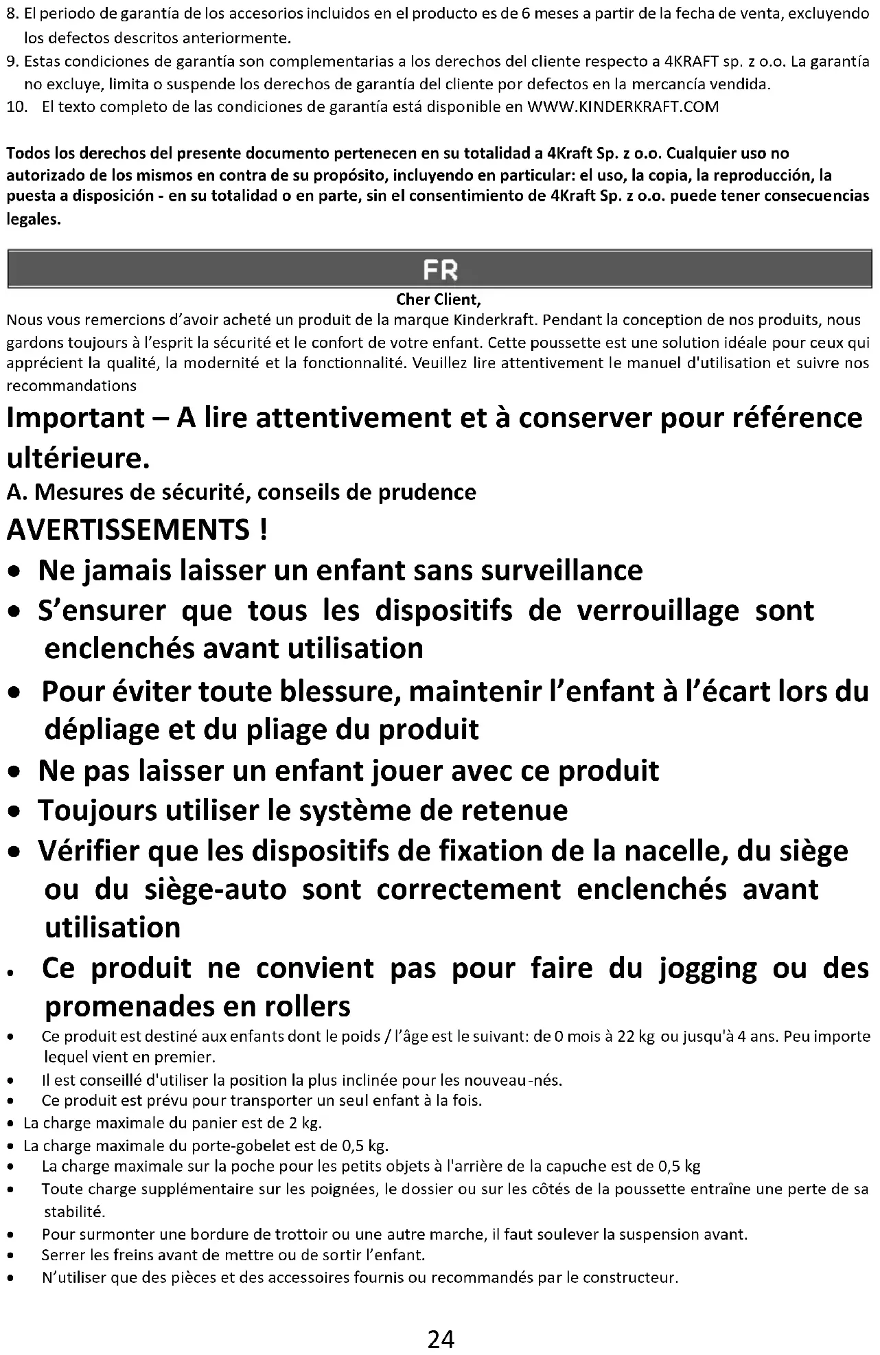 Todos los derechos del presente documento pertenecen en su totalidad a 4Kraft Sp. z o.o. Cualquier uso no autorizado de los mismos en contra de su propósito, incluyendo en particular: el uso, la copia, la reproducción, la puesta a disposición - en su totalidad o en parte, sin el consentimiento de 4Kraft Sp. z o.o. puede tener consecuencias legales. Cher Client, Nousىvousىremercionsىd’avoirىachetéىunىproduitىdeىlaىmarqueىKinderkraft.ىPendantىlaىconceptionىdeىnosىproduits,ىnousى gardonsىtoujoursىàىl’espritىlaىsécuritéىetىleىconfortىdeىvotreىenfant.ىCetteىpoussetteىestىuneىsolutionىidéaleىpourىceuxىquiى apprécientىlaىqualité,ىlaىmodernitéىetىlaىfonctionnalité.ىVeuillezىlireىattentivementىleىmanuelىd'utilisationىetىsuivreىnosى recommandations Important – A lire attentivement et à conserver pour référence ultérieure. A. Mesures de sécurité, conseils de prudence AVERTISSEMENTS !