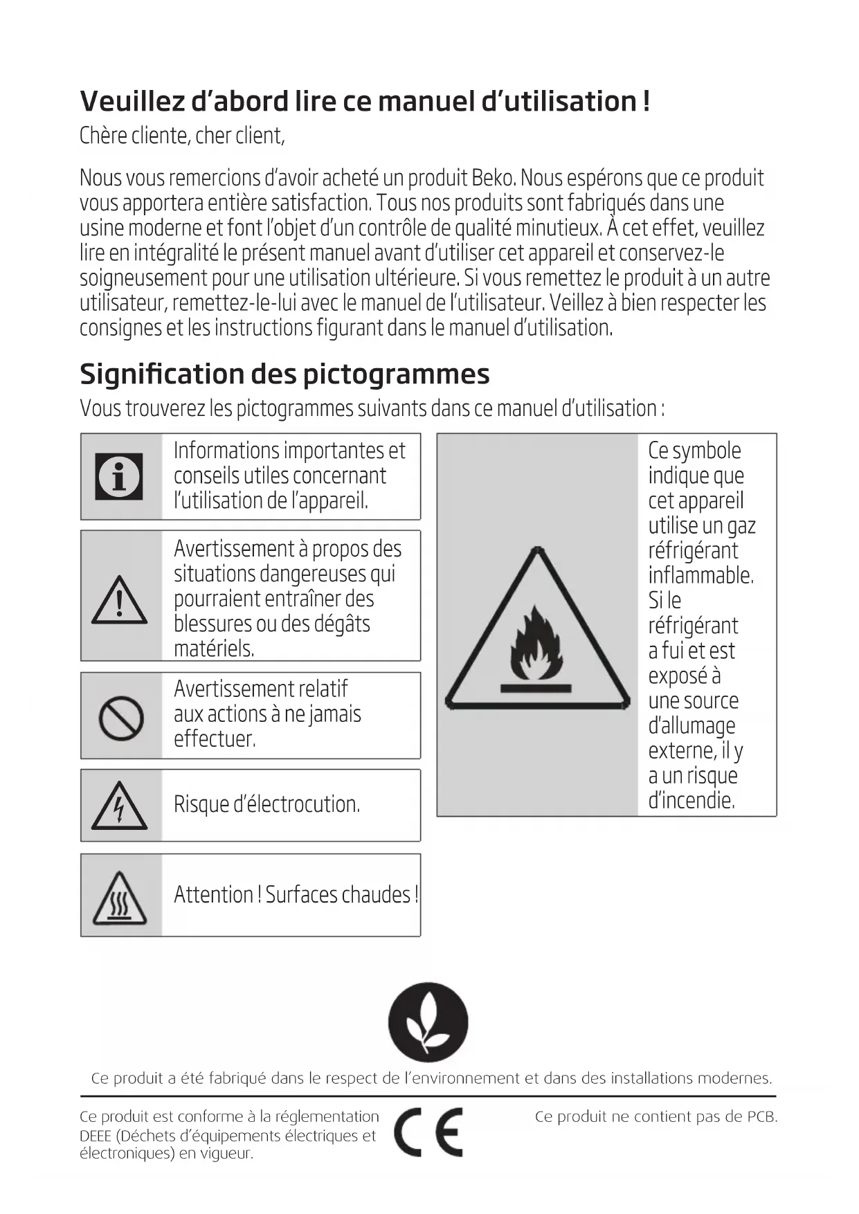 BIMPO 181 BIMPO 271Veuillez d’abord lire ce manuel d’utilisation ! Chère cliente, cher client, Nous vous remercions d’avoir acheté un produit Beko. Nous espérons que ce produit vous apportera entière satisfaction. Tous nos produits sont fabriqués dans une usine moderne et font l’objet d’un contrôle de qualité minutieux. À cet effet, veuillez lire en intégralité le présent manuel avant d’utiliser cet appareil et conservez-le soigneusement pour une utilisation ultérieure. Si vous remettez le produit à un autre utilisateur, remettez-le-lui avec le manuel de l’utilisateur. Veillez à bien respecter les consignes et les instructions figurant dans le manuel d’utilisation. Signication des pictogrammes Vous trouverez les pictogrammes suivants dans ce manuel d’utilisation : Ce produit a été fabriqué dans le respect de l’environnement et dans des installations modernes.Ce produit est conforme à la réglementation DEEE (Déchets d’équipements électriques et électroniques) en vigueur.Ce produit ne contient pas de PCB.
