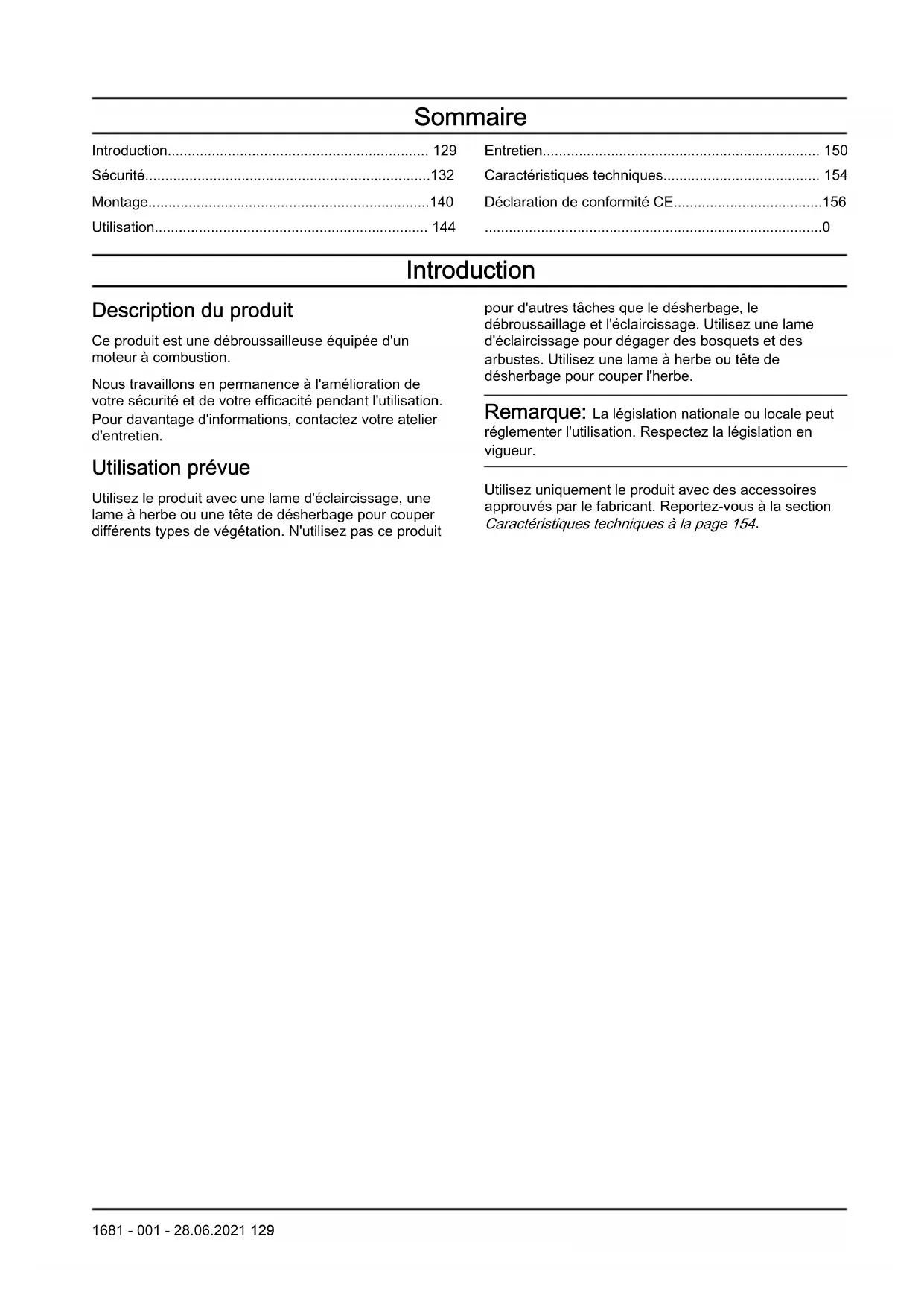Introduction Description du produit Ce produit est une débroussailleuse équipée d'un moteur à combustion. Nous travaillons en permanence à l'amélioration de votre sécurité et de votre efficacité pendant l'utilisation. Pour davantage d'informations, contactez votre atelier d'entretien. Utilisation prévue Utilisez le produit avec une lame d'éclaircissage, une lame à herbe ou une tête de désherbage pour couper différents types de végétation. N'utilisez pas ce produit pour d'autres tâches que le désherbage, le débroussaillage et l'éclaircissage. Utilisez une lame d'éclaircissage pour dégager des bosquets et des arbustes. Utilisez une lame à herbe ou tête de désherbage pour couper l'herbe. Remarque: La législation nationale ou locale peut réglementer l'utilisation. Respectez la législation en vigueur. Utilisez uniquement le produit avec des accessoires approuvés par le fabricant. Reportez-vous à la section Caractéristiques techniques à la page 154