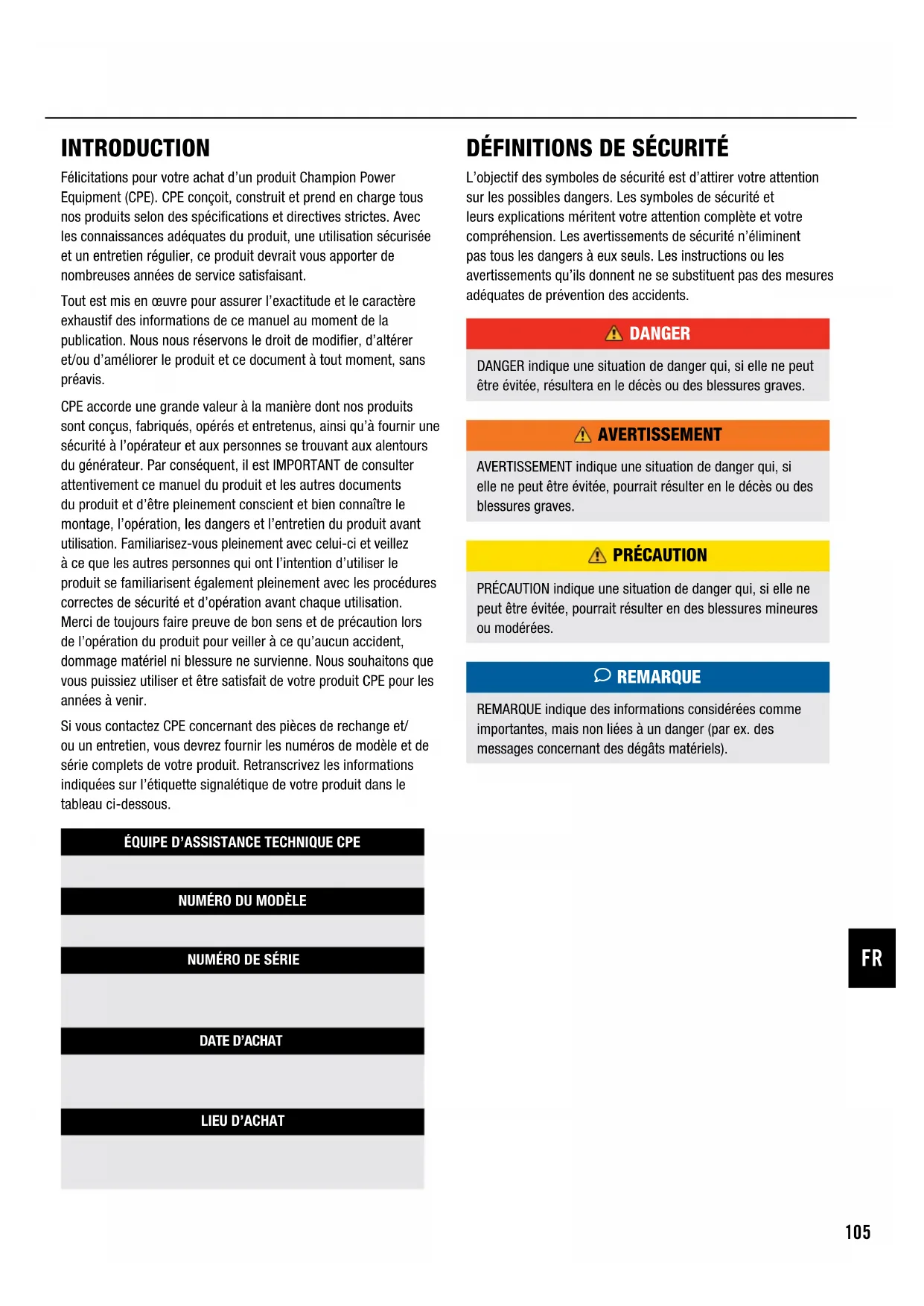 REMARQUE REMARQUE indique des informations considérées comme importantes, mais non liées à un danger (par ex. des messages concernant des dégâts matériels). INTRODUCTION Félicitations pour votre achat d’un produit Champion Power Equipment (CPE). CPE conçoit, construit et prend en charge tous nos produits selon des spécifications et directives strictes. Avec les connaissances adéquates du produit, une utilisation sécurisée et un entretien régulier, ce produit devrait vous apporter de nombreuses années de service satisfaisant.Tout est mis en œuvre pour assurer l’exactitude et le caractère exhaustif des informations de ce manuel au moment de la publication. Nous nous réservons le droit de modifier, d’altérer et/ou d’améliorer le produit et ce document à tout moment, sans préavis. CPE accorde une grande valeur à la manière dont nos produits sont conçus, fabriqués, opérés et entretenus, ainsi qu’à fournir une sécurité à l’opérateur et aux personnes se trouvant aux alentours du générateur. Par conséquent, il est IMPORTANT de consulter attentivement ce manuel du produit et les autres documents du produit et d’être pleinement conscient et bien connaître le montage, l’opération, les dangers et l’entretien du produit avant utilisation. Familiarisez-vous pleinement avec celui-ci et veillez à ce que les autres personnes qui ont l’intention d’utiliser le produit se familiarisent également pleinement avec les procédures correctes de sécurité et d’opération avant chaque utilisation. Merci de toujours faire preuve de bon sens et de précaution lors de l’opération du produit pour veiller à ce qu’aucun accident, dommage matériel ni blessure ne survienne. Nous souhaitons que vous puissiez utiliser et être satisfait de votre produit CPE pour les années à venir.Si vous contactez CPE concernant des pièces de rechange et/ou un entretien, vous devrez fournir les numéros de modèle et de série complets de votre produit. Retranscrivez les informations indiquées sur l’étiquette signalétique de votre produit dans le tableau ci-dessous.ÉQUIPE D’ASSISTANCE TECHNIQUE CPENUMÉRO DU MODÈLENUMÉRO DE SÉRIEDATE D’ACHATLIEU D’ACHAT