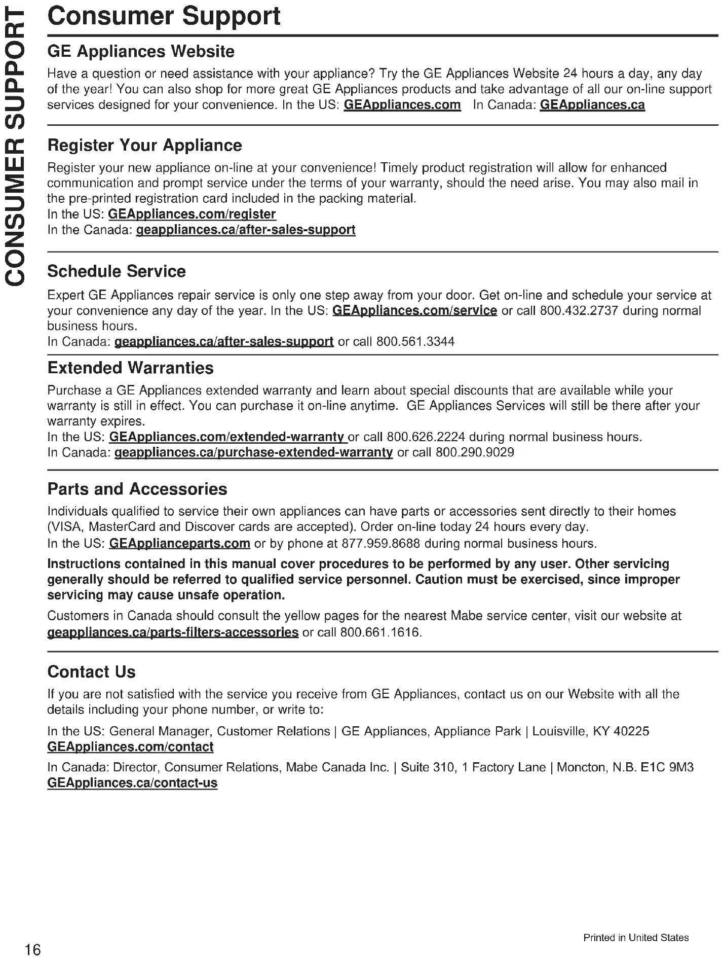 . Pour prévoir une réparation, consultez notre site electromenagersge.ca ou appelez OH*(&$5(9HXLOOH]DYRLUYRWUHQXPpURGHVpULHHWYRWUHQXPpURGHPRGqOHjSRUWpHGHPDLQORUVTXH vous appelez pour obtenir un service. Au Canada,DSSHOH]OH Ŷ /HVYLVLWHVjGRPLFLOHSRXUYRXVPRQWUHUFRPPHXWLOLVHU l’appareil. Ŷ 0DXYDLVHLQVWDOODWLRQOLYUDLVRQRXPDLQWHQDQFH Ŷ 'pIDLOODQFHGXSURGXLWVXLWHjXQDEXVPDXYDLVHXWLOLVDWLRQ ou utilisation à des fins autres que celles prévues ou utilisation commerciale. Ŷ 3HUWHGHYLQjFDXVHGHODGpWpULRUDWLRQ Ŷ 5HPSODFHPHQWGHVIXVLEOHVUpVLGHQWLHOVRXUpDUPHPHQWGHV disjoncteurs. Ŷ 'RPPDJHVXUYHQXDSUqVODOLYUDLVRQ Ŷ 5HPSODFHPHQWGHO¶DPSRXOHRXGHODFDUWRXFKHGXILOWUHj eau, le cas échéant. Ŷ 'RPPDJHDXSURGXLWVXLWHjXQDFFLGHQWLQFHQGLH inondations ou force majeure. Ŷ 'RPPDJHVLQGLUHFWVRXFRQVpFXWLIVFDXVpVSDUGHVGpIDXWV possibles de l’appareil. Ŷ 3URGXLWQRQDFFHVVLEOHSRXUIDLUHOHVUpSDUDWLRQV nécessaires. Ŷ /HVGRPPDJHVjODILQLWLRQWHOVTXHURXLOOHGHVXUIDFH ternissement ou petites taches, non signalés dans un délai de 48 heures suivant la livraison. Ce qui n’est pas couvert : Pour les clients des États-Unis : &HWWHJDUDQWLHOLPLWpHHVWpWHQGXHjO¶DFKHWHXUG¶RULJLQHHWDX[SURSULpWDLUHVVXLYDQWVSRXUWRXW SURGXLWDFKHWpSRXUXQHXWLOLVDWLRQGRPHVWLTXHDX[eWDWV8QLV6LOHSURGXLWHVWLQVWDOOpGDQVXQHUpJLRQRQHVHWURXYHDXFXQ réparateur autorisé GE Appliances, vous devrez peut-être assumer les frais de transport ou apporter l’appareil à un centre de service autorisé GE Appliances. En Alaska, cette garantie limitée exclut le coût d’expédition ou de dépannage à votre domicile. &HUWDLQVpWDWVQ¶DFFHSWHQWSDVG¶H[FOXVLRQRXGHOLPLWHVDX[GRPPDJHVLQGLUHFWVFRQVpFXWLIV&HUWDLQVGURLWVSDUWLFXOLHUVYRXV sont dévolus en vertu de la présente garantie et peuvent s’accompagner d’autres droits qui varient selon votre lieu de résidence. Pour connaître vos droits juridiques, veuillez consulter le bureau local ou le bureau d’état des affaires aux consommateurs ou le Procureur Général de votre état. Garant : États-Unis : GE Appliances, a Haier company Louisville, KY 40225 Pendant la période de : GE Appliances remplacera Un An A compter de la date d’achat initial Toute pièce du réfrigérateur qui s’avère défectueuse en raison d’un défaut de matériau ou de fabrication. Pendant la validité de la présente garantie limitée d’un an, GE fournira également gratuitement la main d’œuvre et le service pour réparer la pièce défectueuse. Cinq ans à partir de la date d’achat d’origine Toutes pièces du système scellé de refroidissement (le compresseur, condensateur, évaporateur et tous les tuyaux de connexion) défectueux en raison d’une défectuosité matérielle ou de fabrication. Durant cette garantie limitée de cinq ans sur le système de réfrigération scellé, GE Appliances fournira aussi, sans frais, toute la main d’œuvre et le service à domicile nécessaire pour remplacer une pièce défectueuse du système scellé de refroidissement. Pour les clients des Canada: &HWWHJDUDQWLHOLPLWpHHVWpWHQGXHjO¶DFKHWHXUG¶RULJLQHHWDX[SURSULpWDLUHVVXLYDQWVSRXUWRXW SURGXLWDFKHWpDX[&DQDGDSRXUXQHXWLOLVDWLRQGRPHVWLTXHDX&DQDGD/HVHUYLFHjGRPLFLOHHQYHUWXGHODJDUDQWLHVHUDIRXUQL GDQVOHVUpJLRQVRLOHVWGLVSRQLEOHHWR0DEHHVWLPHUDLVRQQDEOHGHOHIRXUQLU Garant Canada : MC Commercial, Burlington, Ontario, L7R 5B6