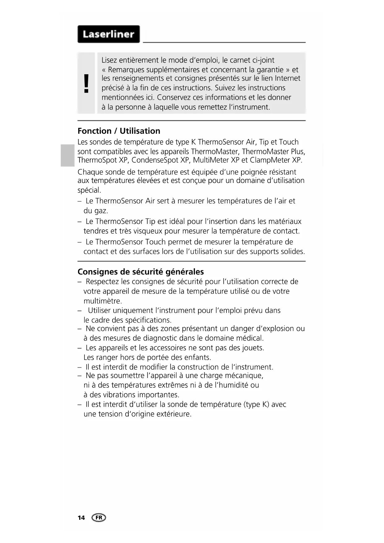 - °C) ± 0,75% (333°C °C) Arbejdsbetingelser -10°C … 60°C, Luftfugtighed maks. 80% rH, ikke-kondenserende, Arbejdshøjde maks. 4000 m.o.h Opbevaringsbetingelser -20°C … 70°C, Luftfugtighed maks. 80% rH Kabellængde 40 … 120 cm Måleføler Air 165 mm Måleføler Tip 185 mm Måleføler Touch 115 mm Dimensioner (B x H x D) Air 22 x 295 x 22 mm (uden kabel) Dimensioner (B x H x D) Tip 22 x 315 x 22 mm (uden kabel) Dimensioner (B x H x D) Touch 22 x 245 x 22 mm (uden kabel) Vægt Air 106 g Vægt Tip 104 g Vægt Touch 96 g DA14 Les sondes de température de type K ThermoSensor Air, Tip et Touch sont compatibles avec les appareils ThermoMaster, ThermoMaster Plus, ThermoSpot XP, CondenseSpot XP, MultiMeter XP et ClampMeter XP. Chaque sonde de température est équipée d’une poignée résistant aux températures élevées et est conçue pour un domaine d’utilisation spécial. – Le ThermoSensor Air sert à mesurer les températures de l’air et du gaz. – Le ThermoSensor Tip est idéal pour l‘insertion dans les matériaux tendres et très visqueux pour mesurer la température de contact. – Le ThermoSensor Touch permet de mesurer la température de contact et des surfaces lors de l’utilisation sur des supports solides. – Respectez les consignes de sécurité pour l’utilisation correcte de votre appareil de mesure de la température utilisé ou de votre multimètre. – Utiliser uniquement l‘instrument pour l‘emploi prévu dans le cadre des spécications. – Ne convient pas à des zones présentant un danger d‘explosion ou à des mesures de diagnostic dans le domaine médical. – Les appareils et les accessoires ne sont pas des jouets. Les ranger hors de portée des enfants. – Il est interdit de modier la construction de l‘instrument. – Ne pas soumettre l’appareil à une charge mécanique, ni à des températures extrêmes ni à de l’humidité ou à des vibrations importantes. – Il est interdit d‘utiliser la sonde de température (type K) avec une tension d‘origine extérieure. Consignes de sécurité générales Fonction / Utilisation Lisez entièrement le mode d‘emploi, le carnet ci-joint «Remarques supplémentaires et concernant la garantie» et les renseignements et consignes présentés sur le lien Internet précisé à la fin de ces instructions. Suivez les instructions mentionnées ici. Conservez ces informations et les donner à la personne à laquelle vous remettez l‘instrument. p. 400