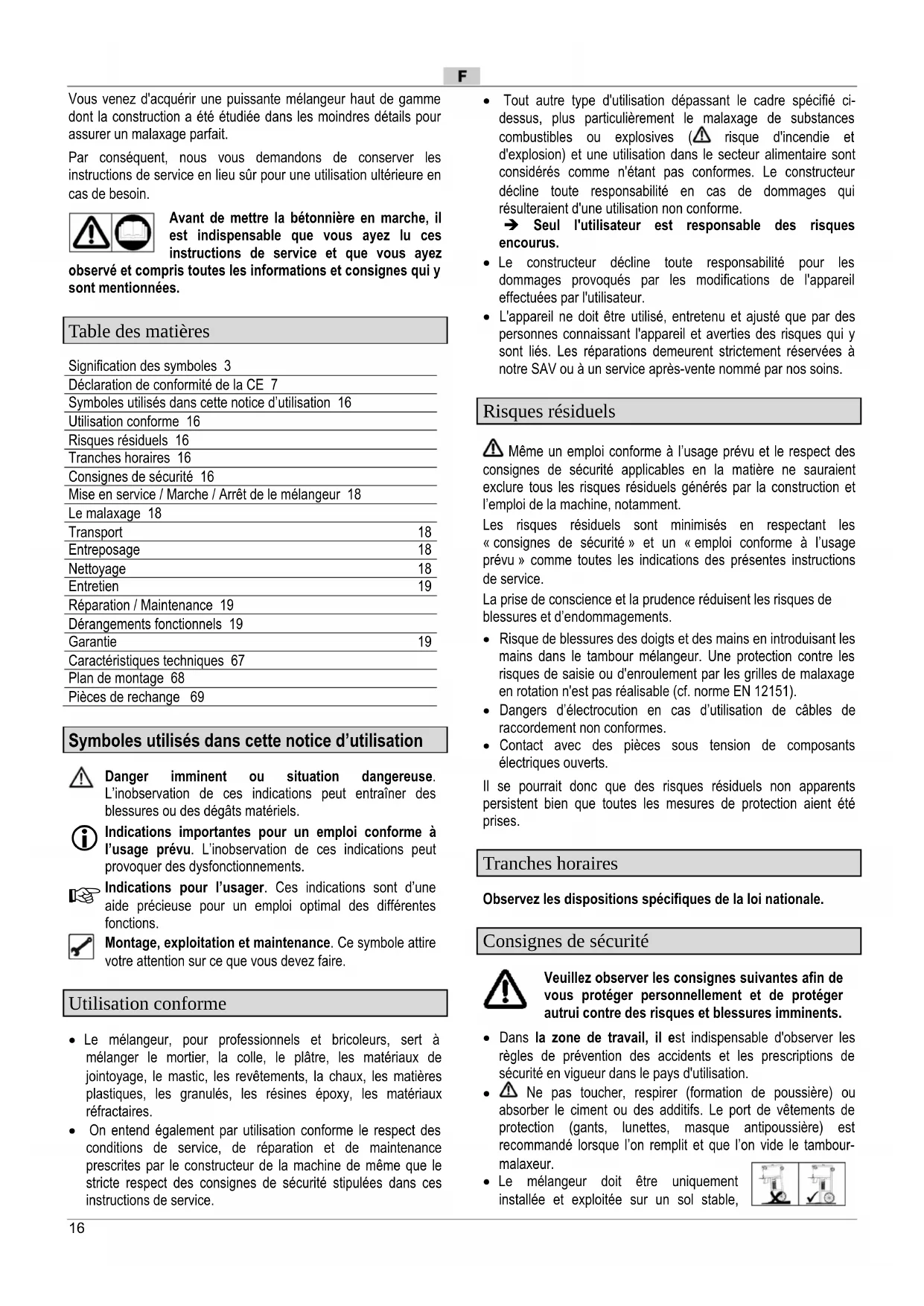 Indications pour l’usager. Ces indications sont d’une aide précieuse pour un emploi optimal des différentes fonctions. Montage, exploitation et maintenance. Ce symbole attire votre attention sur ce que vous devez faire. Utilisation conforme Le mélangeur, pour professionnels et bricoleurs, sert à mélanger le mortier, la colle, le plâtre, les matériaux de jointoyage, le mastic, les revêtements, la chaux, les matières plastiques, les granulés, les résines époxy, les matériaux réfractaires. On entend également par utilisation conforme le respect des conditions de service, de réparation et de maintenance prescrites par le constructeur de la machine de même que le stricte respect des consignes de sécurité stipulées dans ces instructions de service. Tout autre type d'utilisation dépassant le cadre spécifié ci- dessus, plus particulièrement le malaxage de substances combustibles ou explosives ( risque d'incendie et d'explosion) et une utilisation dans le secteur alimentaire sont considérés comme n'étant pas conformes. Le constructeur décline toute responsabilité en cas de dommages qui résulteraient d'une utilisation non conforme. Seul l'utilisateur est responsable des risques encourus. Le constructeur décline toute responsabilité pour les dommages provoqués par les modifications de l'appareil effectuées par l'utilisateur. L'appareil ne doit être utilisé, entretenu et ajusté que par des personnes connaissant l'appareil et averties des risques qui y sont liés. Les réparations demeurent strictement réservées à notre SAV ou à un service après-vente nommé par nos soins. Risques résiduels Même un emploi conforme à l’usage prévu et le respect des consignes de sécurité applicables en la matière ne sauraient exclure tous les risques résiduels générés par la construction et l’emploi de la machine, notamment. Les risques résiduels sont minimisés en respectant les « consignes de sécurité » et un « emploi conforme à l’usage prévu » comme toutes les indications des présentes instructions de service. La prise de conscience et la prudence réduisent les risques de blessures et d’endommagements. Risque de blessures des doigts et des mains en introduisant les mains dans le tambour mélangeur. Une protection contre les risques de saisie ou d'enroulement par les grilles de malaxage en rotation n'est pas réalisable (cf. norme EN 12151). Dangers d’électrocution en cas d’utilisation de câbles de raccordement non conformes. Contact avec des pièces sous tension de composants électriques ouverts. Il se pourrait donc que des risques résiduels non apparents persistent bien que toutes les mesures de protection aient été prises. Tranches horaires Observez les dispositions spécifiques de la loi nationale. Consignes de sécurité