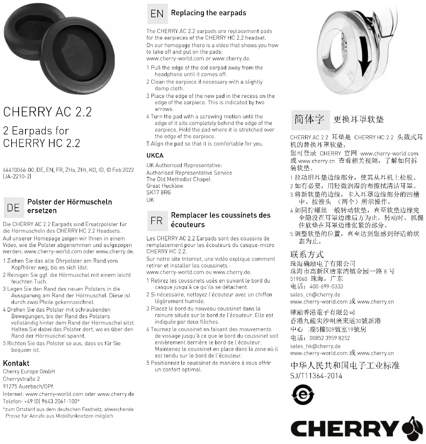 Remplacer les coussinets des écouteurs Les CHERRY AC 2.2 Earpads sont des coussins de remplacement pour les écouteurs du casque-micro CHERRY HC 2.2.Sur notre site Internet, une vidéo explique comment retirer et installer les coussinets : www.cherry-world.com ou www.cherry.de.1 Retirez les coussinets usés en suivant le bord du casque jusqu'à ce qu'ils se détachent.2 Si nécessaire, nettoyez l’écouteur avec un chiffon légèrement humide.3 Placez le bord du nouveau coussinet dans la rainure située sur le bord de l'écouteur. Elle est indiquée par deux flèches.4 Tournez le coussinet en faisant des mouvements de vissage jusqu'à ce que le bord du coussinet soit entièrement derrière le bord de l’écouteur. Maintenez le coussinet en place dans la zone où il est tendu sur le bord de l’écouteur.5 Positionnez le coussinet de manière à vous offrir un confort optimal.