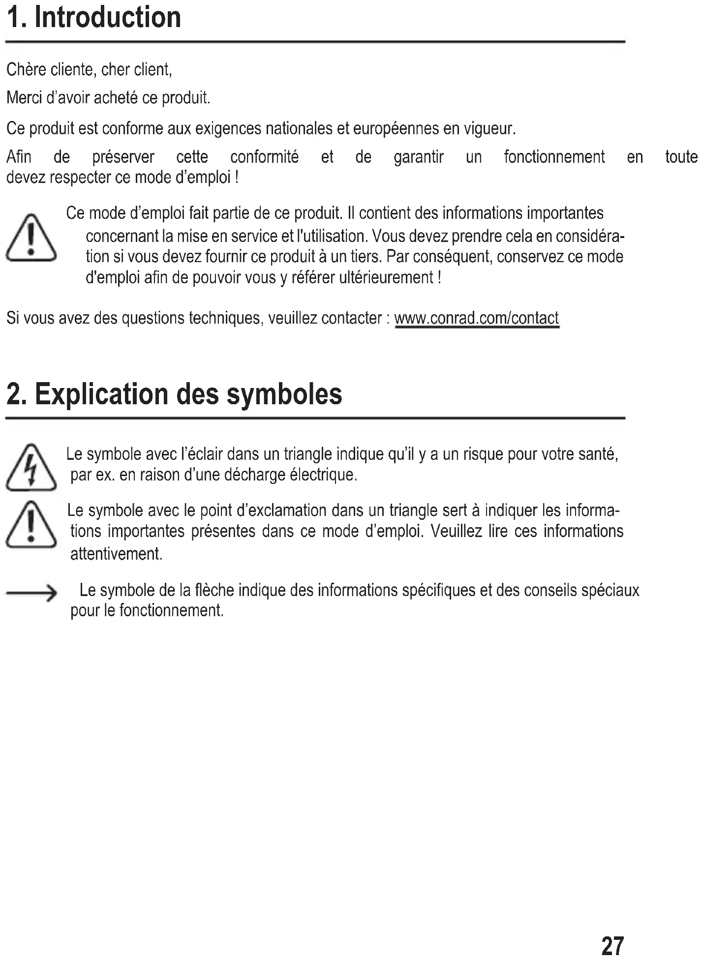Chère cliente, cher client, Merci d’avoir acheté ce produit. Ce produit est conforme aux exigences nationales et européennes en vigueur. An de préserver cette conformité et de garantir un fonctionnement en toute sécurité, vous devez respecter ce mode d’emploi ! Ce mode d’emploi fait partie de ce produit. Il contient des informations importantes concernant la mise en service et l'utilisation. Vous devez prendre cela en considéra- tion si vous devez fournir ce produit à un tiers. Par conséquent, conservez ce mode d'emploiandepouvoirvousyréférerultérieurement! Si vous avez des questions techniques, veuillez contacter : www.conrad.com/contact