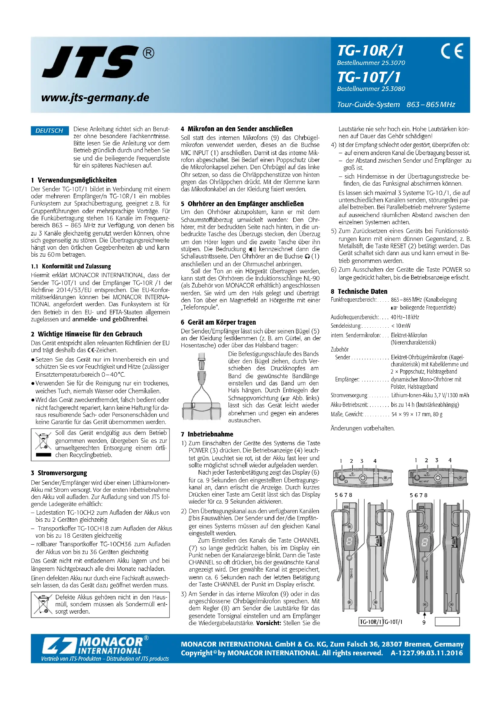 liste jointe des fréquences) Bande passante audio : 40 Hz–18 kHz Puissance d’émission : < 10 mW Micro émetteur interne : micro électret (cardioïde) Accessoires Emetteur : micro électret oreillette (om ni- direc tionnel) avec pince câble et 2bonnettes anti-pop, tour de cou Récepteur : écouteur mono dynamique avec capitonnage, tour de cou Alimentation : accu Lithium-ion, 3,7 V/ 1300 mAh Durée fonctionnement accu : jusqu’à 14 h (selon le volume) Dimensions, poids : 54 × 99 × 17 mm, 80 g Tout droit de modification réservé. TG-10R /1 Référence numérique 25.3070 TG-10T/1 Référence numérique 25.3080 Système Tour Guide 863 – 865 MHz FRANÇAISwww.jts-germany.de