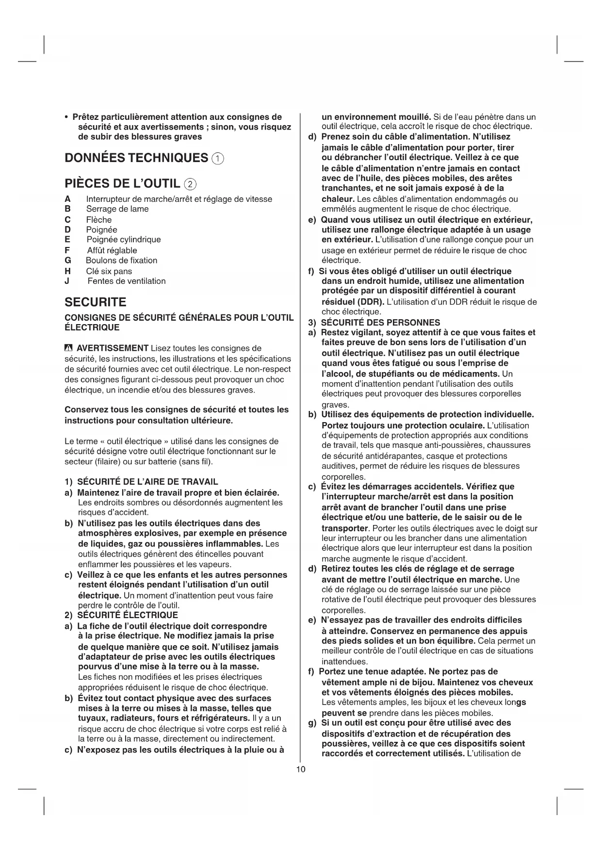 A Interrupteur de marche/arrêt et réglage de vitesse B Serrage de lame C Flèche D Poignée E Poignée cylindrique F Aût réglable G Boulons de xation H Clé six pans J Fentes de ventilation SECURITE CONSIGNES DE SÉCURITÉ GÉNÉRALES POUR L’OUTIL ÉLECTRIQUE - AVERTISSEMENT Lisez toutes les consignes de sécurité, les instructions, les illustrations et les spécications de sécurité fournies avec cet outil électrique. Le non-respect des consignes gurant ci-dessous peut provoquer un choc électrique, un incendie et/ou des blessures graves. Conservez tous les consignes de sécurité et toutes les instructions pour consultation ultérieure. Le terme « outil électrique » utilisé dans les consignes de sécurité désigne votre outil électrique fonctionnant sur le secteur (laire) ou sur batterie (sans l).